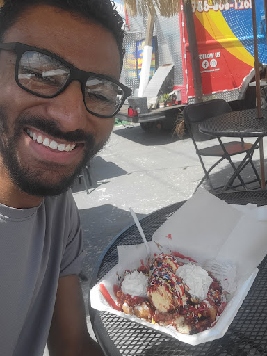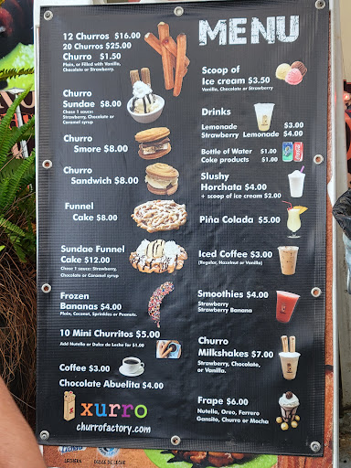 This is a dessert food truck. The churros here are really good they sell them plain or filled with chocolate, vanilla or strawberry ( regular size ones) and they also sell plain small ones with Nutella or lechera. We have had a couple of the shakes and the piña colada is really good. They sell funnel cakes, frozen banana, frappes and much more. There are a few picnic tables...
