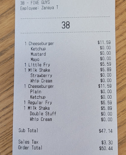 I've been coming to Five Guys off and on for the last 10 years. They undeniably have a great burger. However, I believe their pricing has gone a little overboard. My husband and I come here, order 2 cheeseburgers, one small fry and one regular fry, and 2 milkshakes, for a grand total of $50! Fifty dollars for 2 adults to grab a fast food meal? That is outrageous. 4 adults or a family of 4 is easily $100 bucks. Unless you're made of money, this is REAL eating out. Spending $50 makes me wish we could have gone to a dine-in serving restaurant instead.