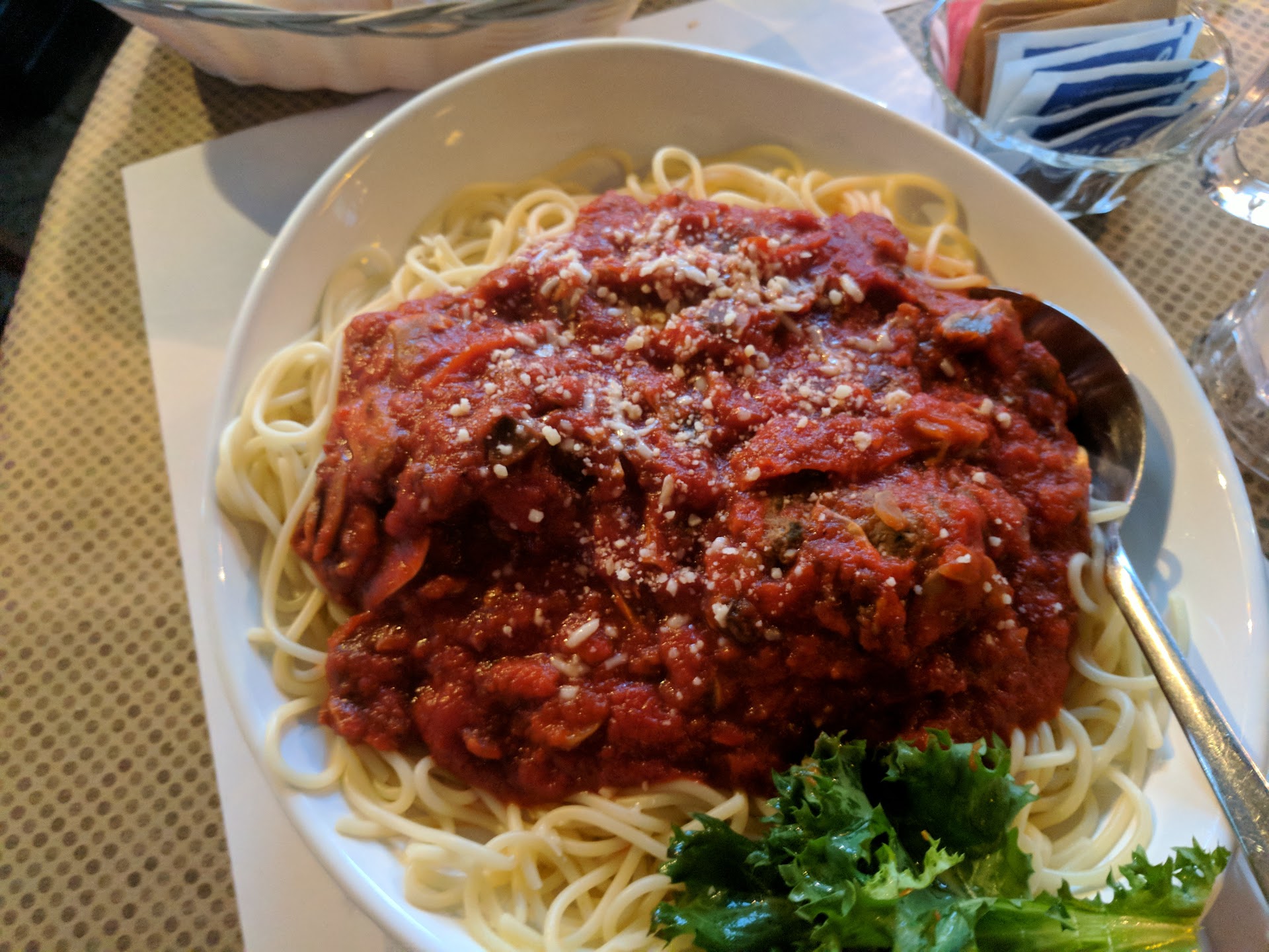 While waiting for our entrees, we were served a basket of garlic bread. The bread was fresh, warm, and plenty of butter and garlic. A nice treat. The ravioli also came with a small house salad. Good, but nothing out of the ordinary.