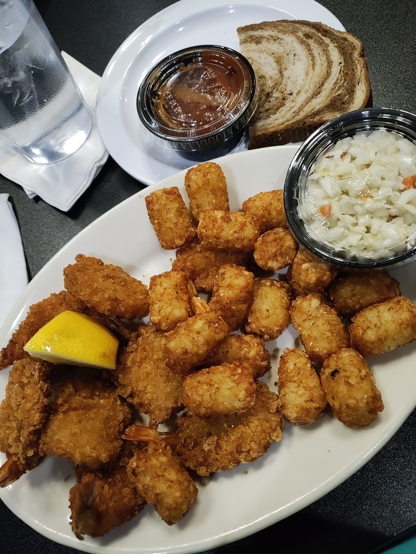 There was Ocean Perch, Walleye Pike, and Taco Salad ordered, and I had the Fried Butterfly Gulf Shrimp with Tots. For the most part everyone enjoyed their dinners. The shrimp, though tasty, were quite small making the price for the dinner quite steep. One person ordered the "potato pancakes" which he said were nothing more that squashed tater tots. Not enough of an issue to make a complaint, but certainly something you should be aware of if you're actually wanting potato pancakes - which these are not. OH! I also started with a cup of Cheesy Sausage Potato Soup. Just Delicious.