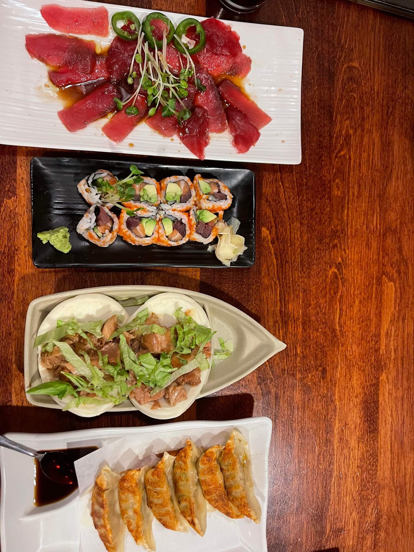 Gyoza: Absolutely fantastic - delicious! Chicken egg rolls: Also absolutely delicious! Pork Buns: Not our favorite - salty and fell apart easily. Most pork buns have BBQ sauce but these had none. Suggestion: add BBQ sauce, remove the lettuce, add scallions. Spicy Tuna Roll: Different than what we are used to, but buy and large not bad :). Had two different sauces, not mayo based. Philly Roll: This was good! Tasty and well prepared. Tontoro Ramen: Filling but could use garlic - by no means was it bad - just missing something. Dan Dan Spicy Ramen: Similar feedback to the tontoro - needed garlic. Much better than the tontoro in that it has more flavor and spice - just needed more. Chicken fried rice: Pains us to say it, but this was just not good :-/. Needed a lot of work. Bland, the chicken tasted kind of old, and it desperately needed more color (I ended up adding some of my wasabi infused soy sauce from the sushi and it instantly was better). My suggestion = add some garlic, some diced carrots and corn, more scallions, sesame seeds, egg, and a hard sear on the rice to give it some texture).