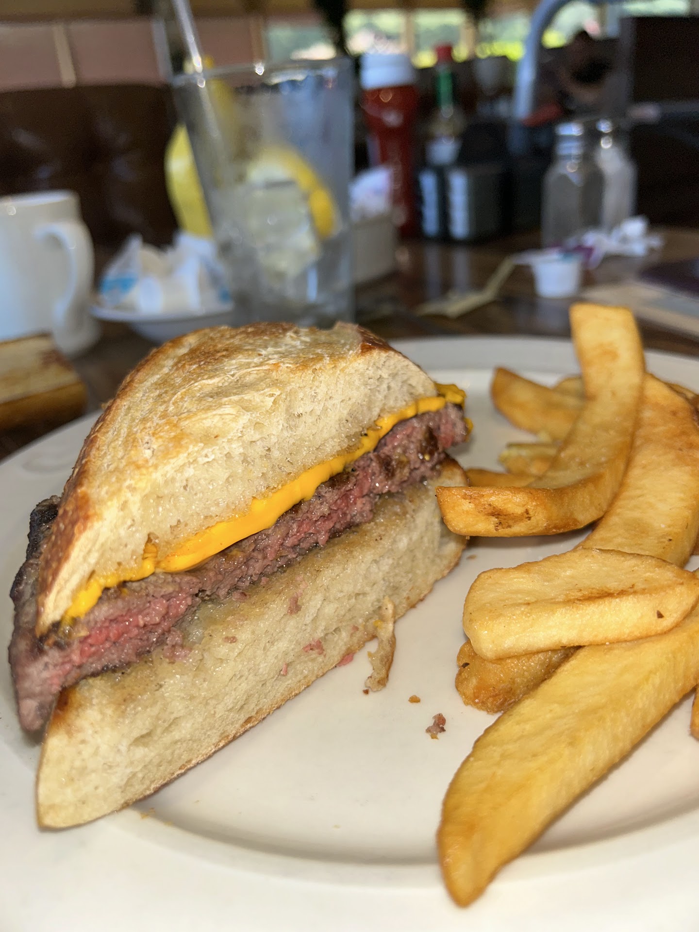 I ordered the ā3/4 Broiled Hamburgerā medium rare, with American Cheese, and it was cooked to perfection. The cheese was slightly melted just right, and it was served on toasted French bread, cut at an angle ā a nice touch in presentation. The plate was beautifully arranged with sliced tomatoes and leafy lettuce, accompanied by golden, lightly salted country style fries. Yum! It doesnāt get much better than this.