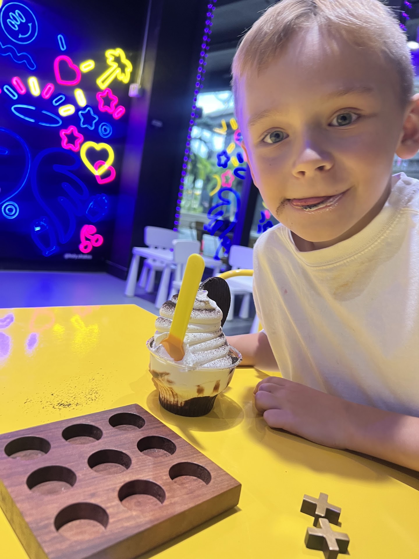 INCREDIBLE PLACE! Kid friendly, they have games at the tables, protein shakes, regular shakes, they offer milk substitutions, other dessertās, awesome decor and lights, super friendly staff. My boyfriend and I were visiting from Michigan, had just gotten done having dinner and were walking talking about how we wanted something sweet when one of the workers was handing out a coupon to people outside. We went and it was an awesome experience. We both got the protein shakes and they were soooo good!! Highly recommend to locals and tourists. We were also given brownie samples that they were working on to try which were delicious!! Staff was so accommodating...
