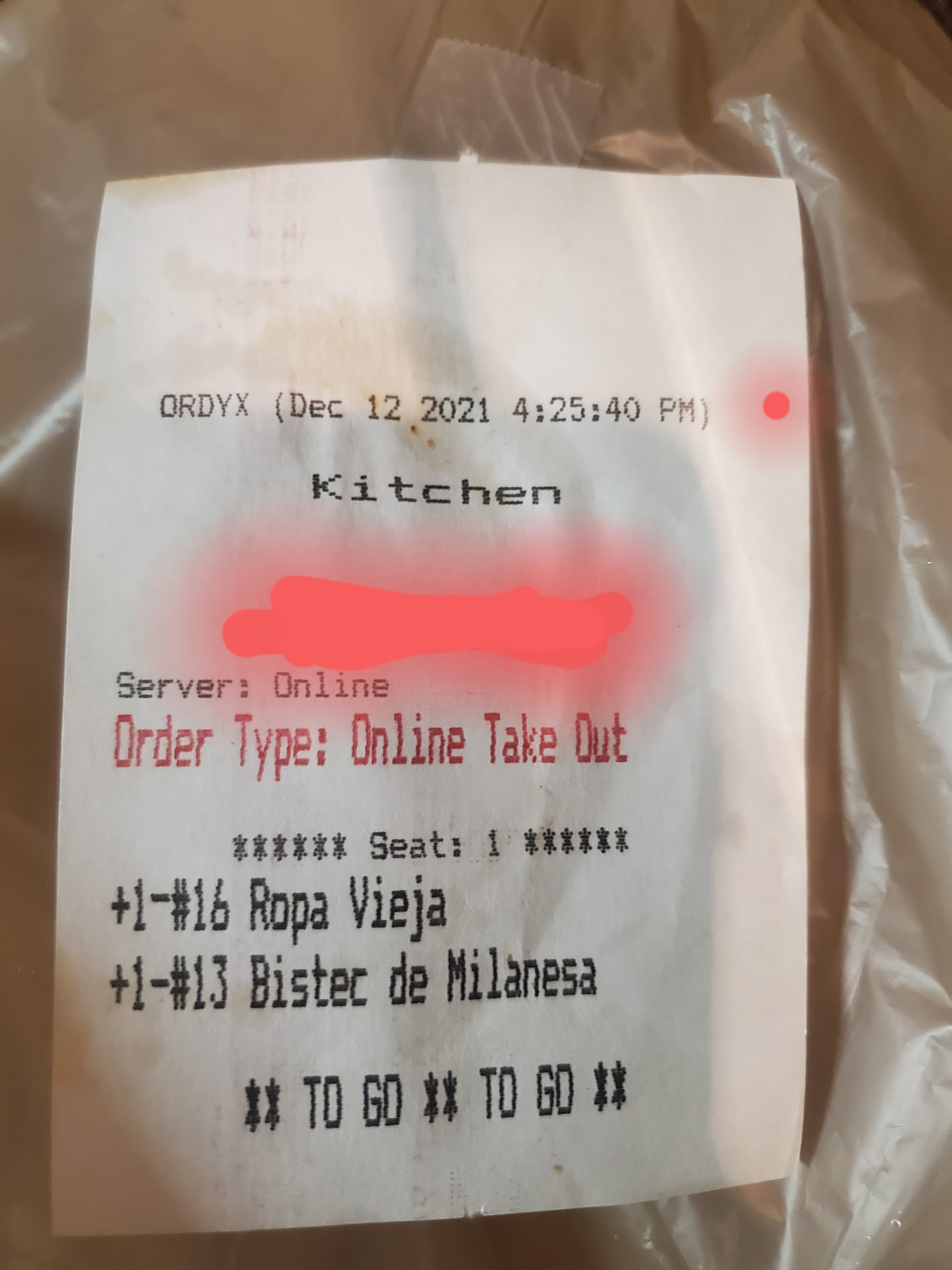Ordered ropa vieja and bistec de milanesa. Received the bistec de milanesa with all the sides, the shredded beef and black beans but missed the rice and maduros that come with the ropa vieja order. Instead I received a container with mariquitas and mojo sauces. Called the restaurant to explain the situacion and the lady that answered didn't even offer an apology. She tried to blame it on the driver saying he probably had multiple orders and didn't grab one bag. But this is not the case, the bag that I received has a receipt with the name of both orders. This means that the restaurant made a mistake when they were putting the food in the bag. They probably had 2 orders wrong and someone else has my rice and is missing their plantain marikitas. I said to the lady that if I paid a doordash service is because I don't want to drive to their restaurant for a reason, if she is asking me drive over there for a rice and considering they made a mistake they should offer some kind of incentive or compensation. She sarcastically laughed, said good night and hanged up the phone while I was talking, EXTREMELY RUDE LACK OF MANNERS. These people rather loose a customer and get some bad reviews then making up for their mistakes. Horrible experience , this never happened on any other restaurant on uber eats or doordash.