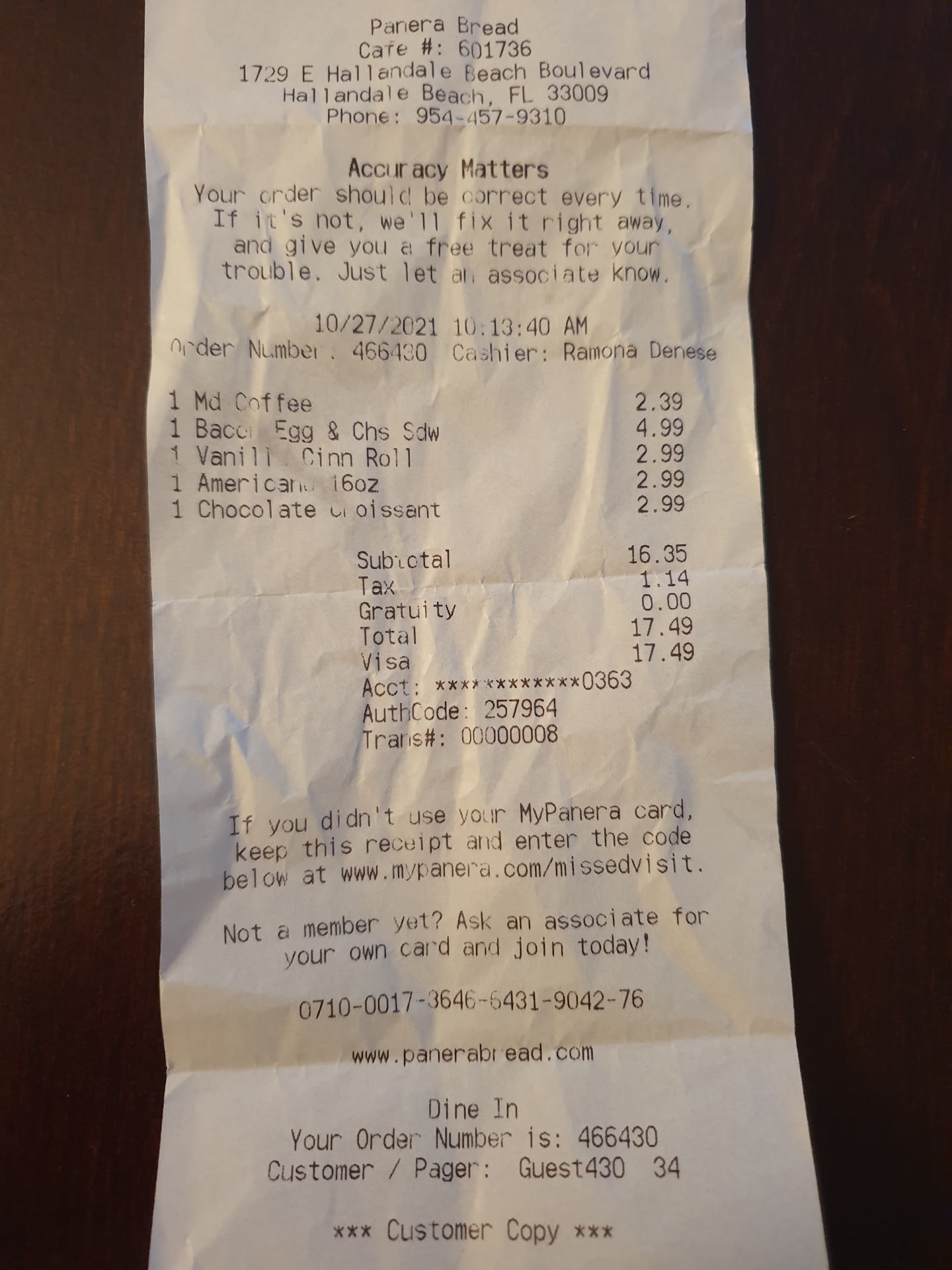 In one month that I lived in Hollywood, I tried this place and never felt good getting food from here. Today March 24th 2021, after my morning jog, I went to pick up my coffee and bagel that ordered through MyPanera App. I place order around 8:10 and went to pick up around 8:32. The manager, I think she said her name is Paula, was probably having bad day and was very rude. 1st see assumed I was doordash pick up and when I went in front of cashier she said you have to give me a minute. There was a gentleman ahead of me waiting for past 15 minutes for his order. After waiting When I complained after waiting for 10 minutes that it is not normal for us to wait that long for an order that was place more than 35 minutes before. She started saying it is not our fault the order didn't came to system. Finally, after she realized that my order was MyPanera and she apologized and said would give credit if I wait for cashier. I simply got my order and walked away. The point is, I understand we are human and we may have bad days, but making customers feel that is our fault when we are the reason for the existence of the business is something totally wrong. The manager was working hard, but Panera definitely need to invest in staff to train and help create an environment which make customer feel valued as Startbucks does. Unfortunately, Panera lost me as customer forever now. Not only in Florida, but where I...