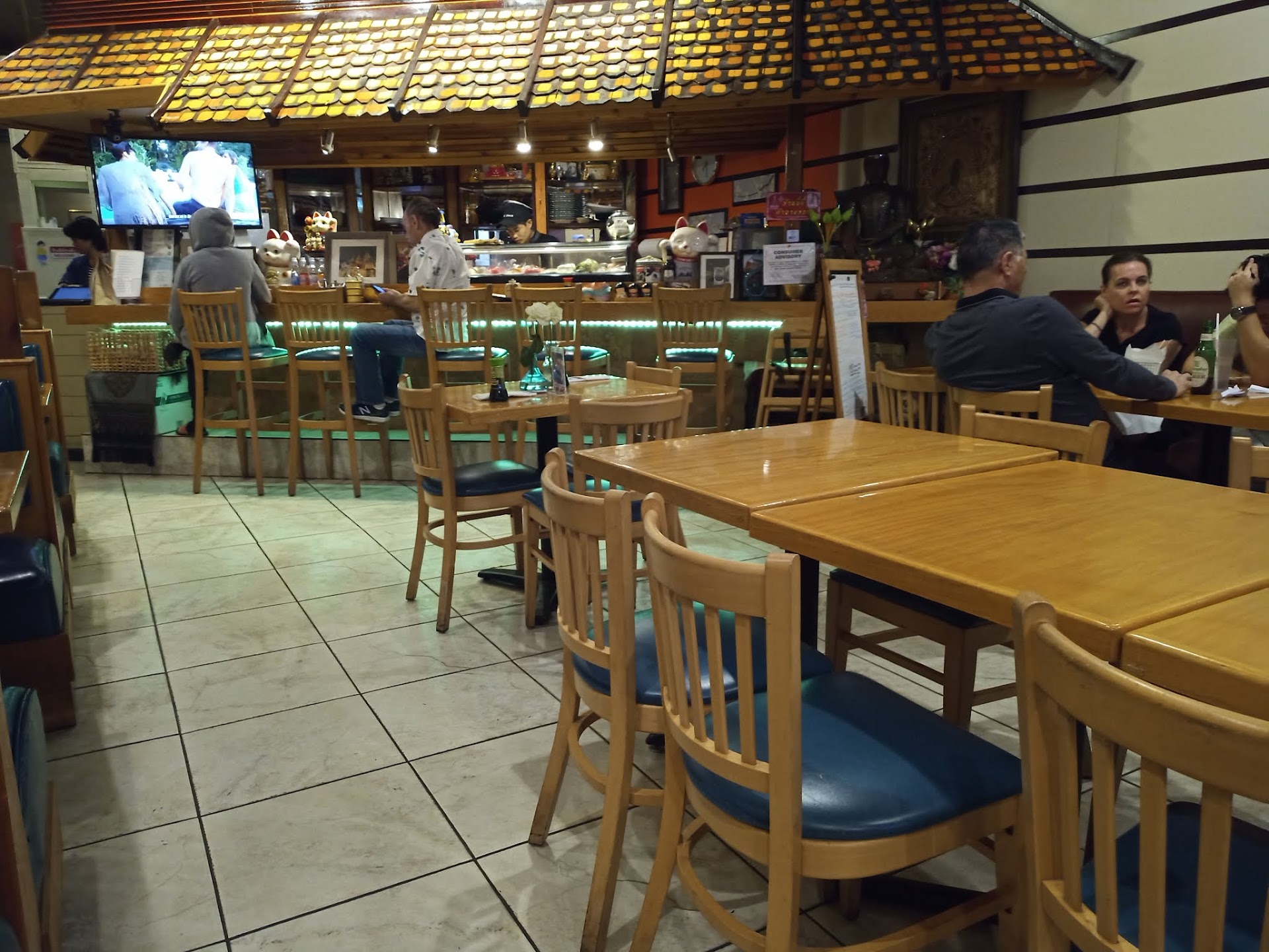 We had the pleasure of being served by the owner Sa. She was very busy as she had given an other server the evening off in order to study. In any case we soon had our first round of drinks ( Foreign beers $5.99). The menu offers many Thai and Japanese choices. For appetizers we decided on Vegetable Spring rolls ($5.99) and a Tom Kar Chicken soup (Hot) ($5.50). The Spring Rolls consisted of 4 finger size, hot, crispy and very tasty rolls with sweet chile sauce. The soup had plenty of chicken and vegetables and was wonderfully tasty and spicy.