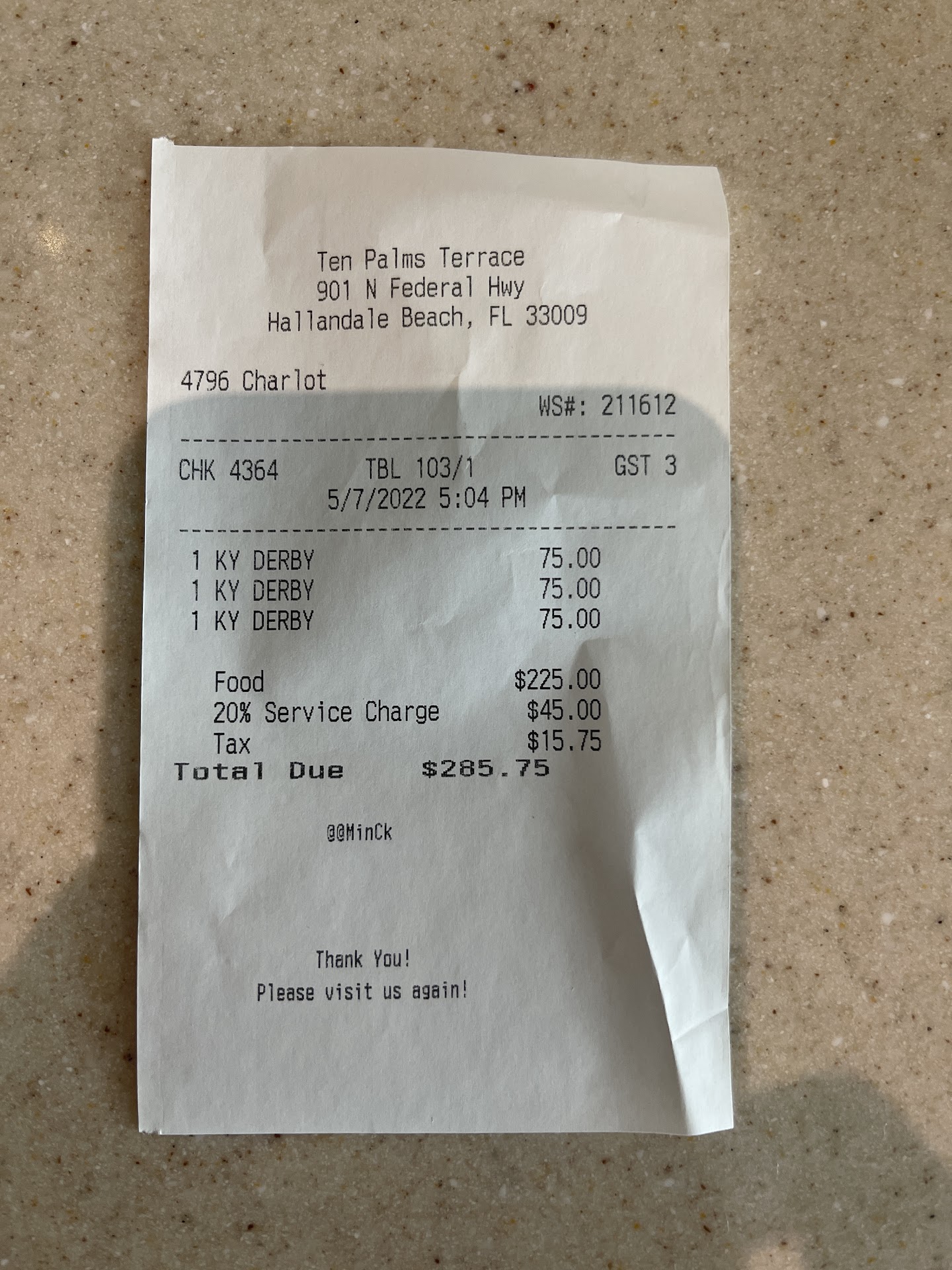 Read moreUpdated Review 11/62023 Breeders Cup Saturday. First as always the food was amazing. I really would like to say thank you to Charles for his excellent service and hospitality. My party of 6 with 2 being first timers at Ten Palms and Gulfstream were Wowed with the service and food. I highly recommend Ten Palms not just for the big races but for Dinner also. 😋 Again this is an update for awesome 👌🏾 service. We will definitely continue dining at Ten Palms. Marie Pittman-Francis