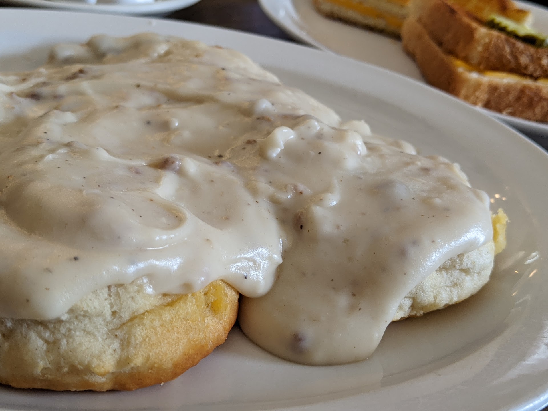 30 minutes passed before our food arrived. We had been here an hour now. What we got was: Biscuits and gravy that were luke warm ( a skin had formed onto of the gravy! 🤢) Hashed browns that were barely cooked. They're were still white, cold inside and tasted like they had absorbed whatever cheap oil they had briefly been in. My roast beef sandwich was simply two UNTOASTED pieces of raw white sandwich bread with a few ounces of sliced beef between them. This was then covered with gravy that tasted straight out of the McCormick packet. It was like warm and the gravy was getting gelatinous like jelly and had a skin forming as well. Mushy. Cold and gross. Needless to say, we ate half our food and wanted to just leave. I would've mentioned this to the server but no one came by to check on us