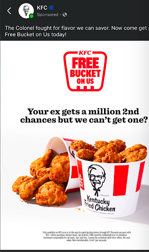 Read moreThis is the ad I saw that convinced me to make my order today. The ad talked about second chances because the company as a whole knows they suck. Well it’s too bad they squandered their second chance because I don’t believe we will be ordering from any KFC again. We used this promotion and also ordered about $15 worth of sides to meet the criteria. After the mobile order was placed, we were given a 10 minute wait time. We arrived at the KFC a little past this 10 minute mark. The lobby was closed due to short staffing. They parked us after going through the drive-thru and then We proceeded to wait 30 minutes after the first 10 mins. So 40 minutes total for a $15 order. They were out of two of the sauces we wanted, KFC sauce and “Comeback” sauce (which is ironic). The chicken was fine but very slimy skin. The gravy on the mashed potatoes tasted fermented. There were no napkins or utensils in the bag at all.