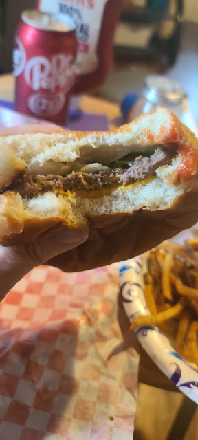 With that said, on my first visit, I ordered a double patty burger with cheese meal. I noticed that the french fries had we out in a grey tray on a chair, while sat a similar tray with lettuce. I kind of got grossed out a little, but looked past it because it had such good reviews. When my order was ready, I eagerly picked it up. The soda is served in cans, which I particularly don't care for. I'd rather have a fountain soda, but no issue. The meal cost me a little of 9 bucks if memory serves me correct.