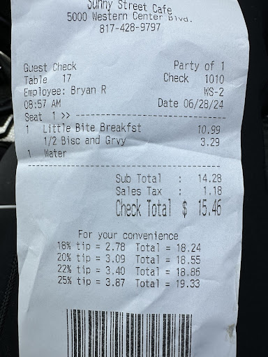 Apparently the ticket being on the table meant she didnât need to come by again, as I had to flag her down for a refill for my coffee. Never stopped by again after the coffee refill. Didnât offer to-go drinks.