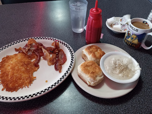 The food was nearly inedible and multiple things in our order were incorrect. Despite me and my partner being the only 2 people in the restaurant, we waited 20-30 minures for our food. The waitress interacted with us almost exactly 3 times: To sit us down. To take our order. And to give us our check. We did not receive any refills on our drinks, nor did she check on us while we were waiting for our food or while we were dining. Her demeanor was entirely unfriendly, and made the dining experience more unpleasant than it already was. I ordered the chicken-fried steak and my partner got a breakfast platter. I asked for hard fried eggs and received unseasoned medium eggs, my partner asked for no bacon, and extra sausage links. He received extra bacon and sausage patties. When my chicken-fried steak had arrived I couldn't even see the steak because of how much gravy was slathered on it, and the steak itself had such a terrible flavor I couldn't even finish it. Both of our hashbrowns had a mushy texture and tasted similar to poorly seasoned mash potatoes. The toast my meal came with was as crunchy as a crouton, I could genuinely snap it in half. The best part of my meal was the bacon, which was mediocre at best, it tasted like your standard store-bought bacon. This is by all means personal preference, but I found the atmosphere of the restaurant to be dull and uninviting.