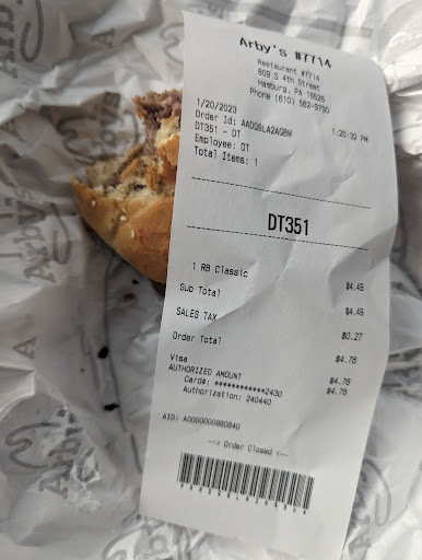 Read moreMy husband and I ordered the most delicious, hot and fresh meal at this location on August 3, 2020 at 10:57am. Our order number was 13. We order the freshest tasting Turkey/Ranch/Bacon sandwich, Crispy Chicken Bacon Swiss sandwich, 2 medium crispy crispy & hot curly fries. Then we washed it all down with the most thirsty satisfaction in drink choices of: fruit punch & sweet tea (Best tasting ever). We are from Tennessee, so thank you Tyler the Manager at this location for having such an amazing, friendly & polite team members that executed our meal! We use to eat Arby's a lot then stopped. After stopping through PA to this location, we recommend 👌 this location to anyone & everyone 😉. Thank you for your service...