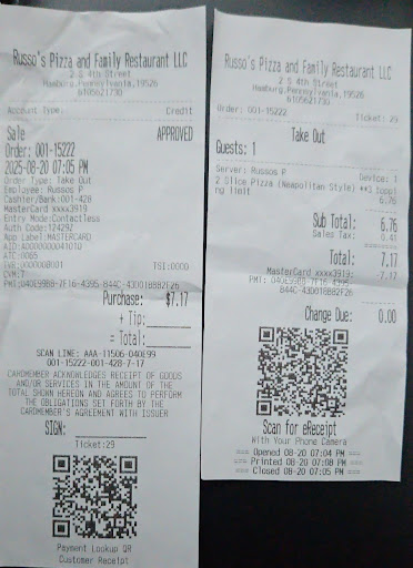 Read moreI’m a door dasher and I recently picked up and order from Russos and right when I was about to drive away the cashier ( or manager) I’m not sure came up to my car and threatened to call the cops if I didn’t show her my phone ( the confirmation) after i showed her the CONFIRMATION OF THE ORDER! she insisted I get out of the car and give the foood back? Meanwhile my pit bull in the backseat is freaking out and barking I requested if she would step away ( she had her hand ON my window) and leave me alone but still threatened me untill I drove away. That was absolutely unnecessary and I will never...