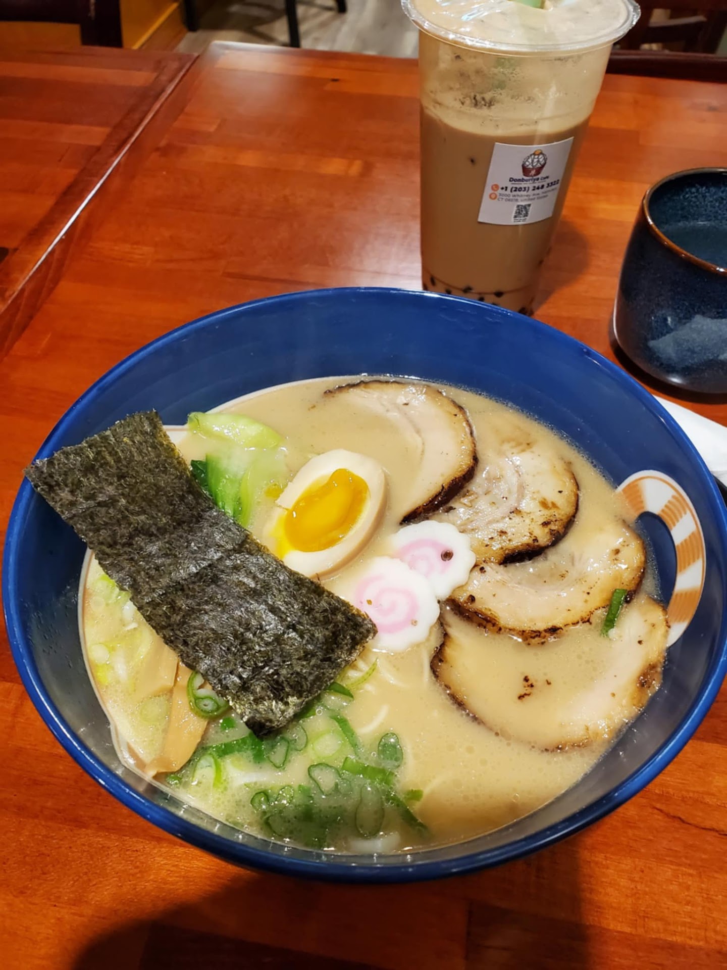 We started with a buy-one-get-one offer on peach and milk tea boba. For our main courses, we chose the tonkotsu ramen, chasu udon, and unagi kimbap. Each bowl of noodles came with four large slices of meat, which was quite generous, and the noodles were perfectly bouncy throughout our meal. The service was outstanding, which is not easy to find in Connecticut. We arrived 30 minutes before closing, yet the staff greeted us with friendly smiles and provided excellent service. They asked if we preferred our water cold or hot, a thoughtful touch that we appreciated.
