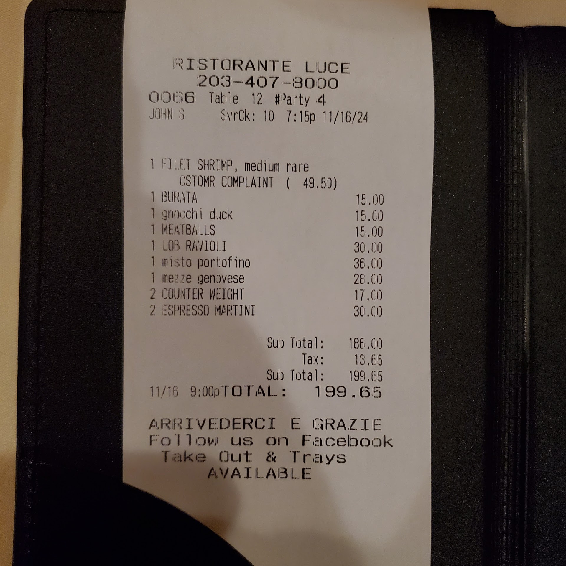 Read moreIn my 74 years of restaurant dining experience I have never encountered treatment as rude, inconsiderate, and unprofessional as that which Lucè demonstrated. I made reservations 2 months in advance of a family birthday celebration for my 2 daughters, and the night prior to our dinner I called to confirm the arrangements. The person I spoke with assured me that there would be a "special" table for 7 in the lower main section ready at 7:00 PM. All 7 of our party were there at 7:03......but there was NO table available, although the host acknowledged the reservations were made. We waited over 30 minutes, were offered outdoor seating (it was NOT an outdoor dining evening), but despite my explanation of the care I had taken to plan this celebration, they had no table for us. The manager later offered us a table in the corner of a back room.....and that was the last insult I would tolerate. Our party left and had dinner at another restaurant 20 miles away, but well worth the drive. Lucè's food may be very good, but it is not an acceptable substitute for absolutely unacceptable customer service! ...