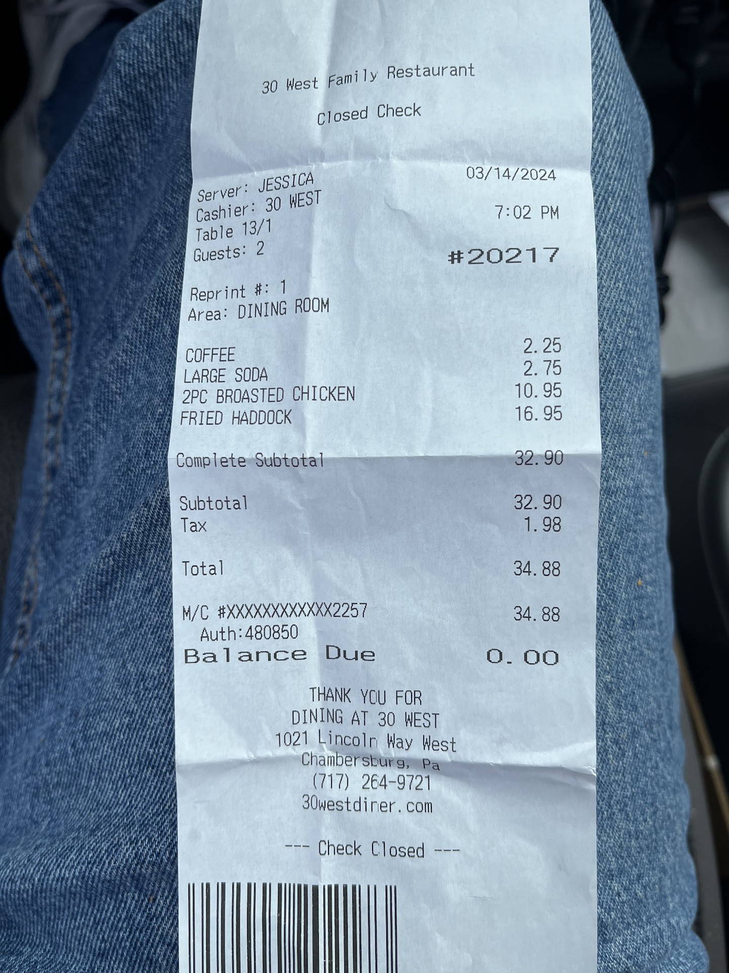 Finally, after sitting about 10 minutes, our waitress (Jessica) came over to take our order and I had ordered the batter, dipped haddock dinner, and my husband ordered two piece broasted chicken dinner.