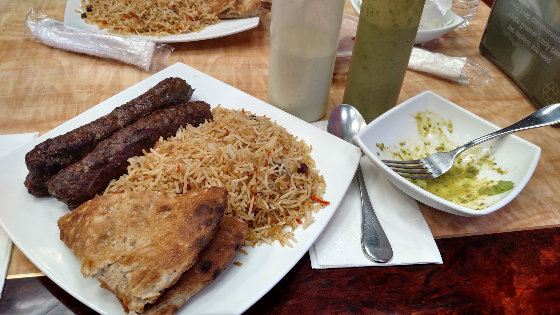 We were three people. We ordered three entrees - Chapli, Falafel, Gyro and hummus with the idea to share. The hummus had a bit of a delightful kick to it and was served with warm pita that somehow was soft yet crunchy at the same time. I honestly could have just kept eating that. Then the entrees came out.