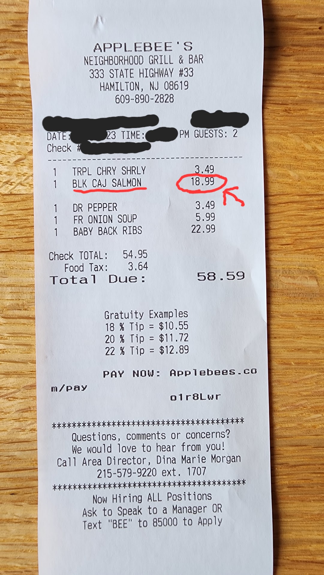Read moreMot much of an Applebee's guy but we had gift cards so we checked it out. Applebee's on Rte.33 in Hamilton Twsp NJ. Have to say I was quite pleasantly surprised...!!! Started with our waiter, Norman, 3 days out of training, and you'd never know he was new if he hadn't told us. I have a special needs diet, I am dairy intolerant, so Norman informed his manager, Billy Bragg, who assured us he would personally let the kitchen know and follow up to ensure my meal was properly prepared. So Norman took our order, repeated the entire thing back to us for confirmation, offered suggestions on substitutions for my disallowed items, and told us he would check before he brought our meal to ensure correctness. Well, bottom line, the meal was great...!!! My wife and I did the 2 for 25 sirloins, medium to well, and everything came out exactly as expected. Following the meal I needed to visit the restroom, and let me say how clean I found the facility was beyond expectations. I come from a food service background in convenience store of 37+ years, and I know the impression that a clean bathroom leaves on the customer. This one was certainly on the mark. Infact, I wad so impressed I called back the manager to tell him how pleased I was. Bottom line, I am now an Applebee's guy, knowing I can get my meal cooked the way I need it done, and that the service will be 5 star. Kudos again to our waiter Norman, and his manager. Billy Bragg for an experience worth...