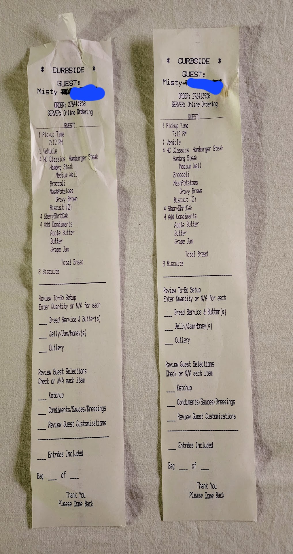 *Attached is a picture of both receipts, however one receipt was on one (the first bag) I picked up. NOTICE, Nothing is checked....maybe if they checked off everything as they put it in the bag...this could have been PREVENTED!!