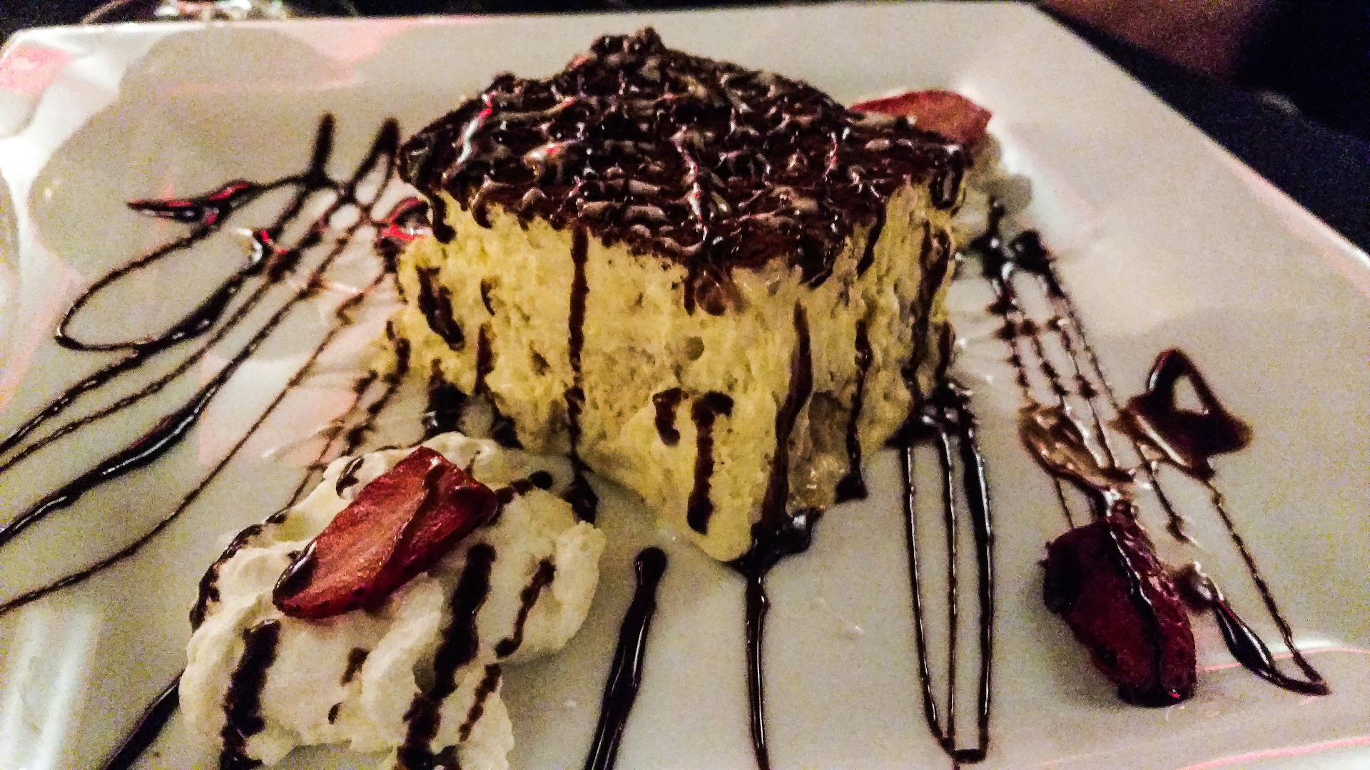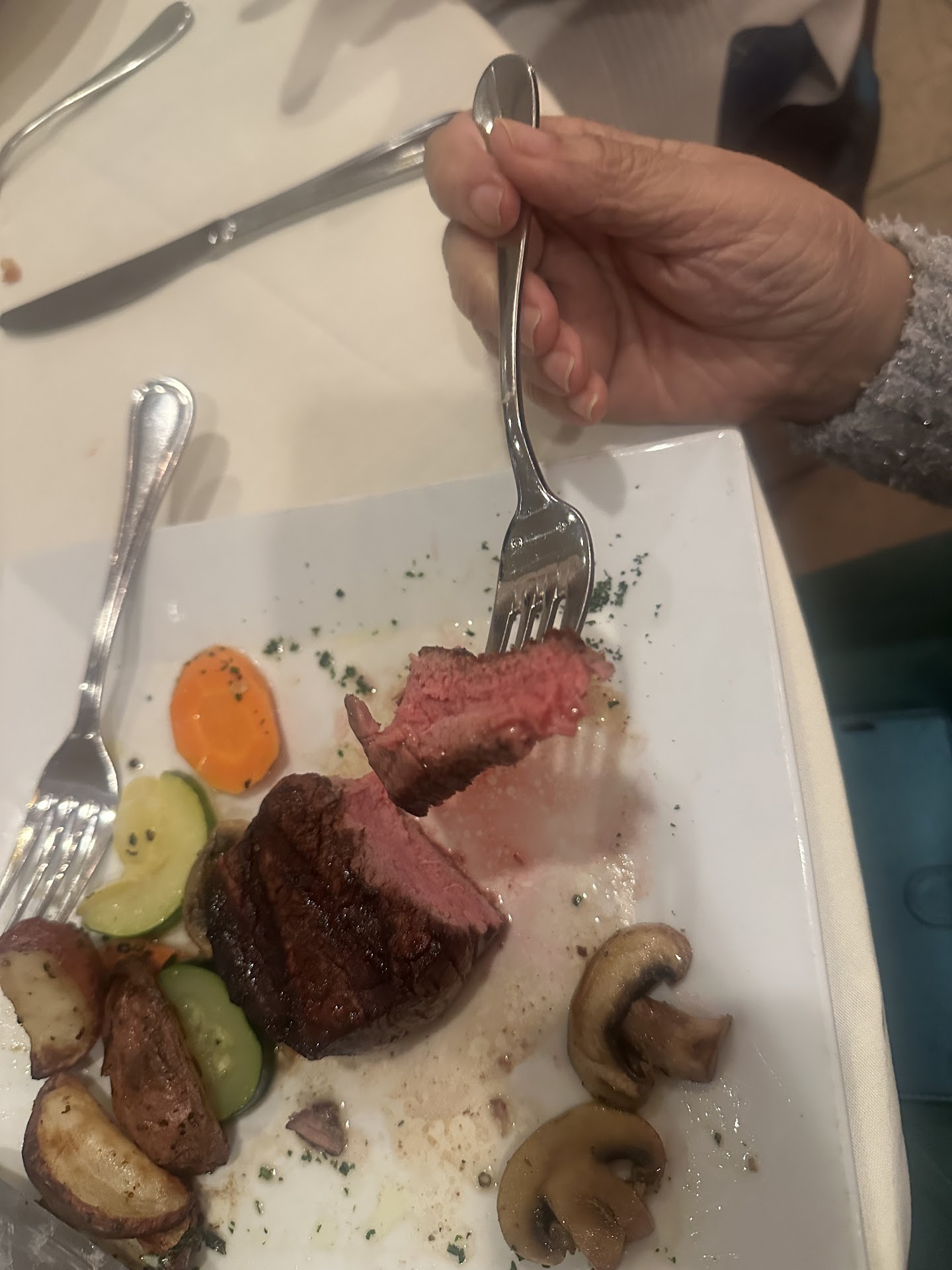 From this moment on, I can only talk about the entrees served to my boyfriend and I. I ordered the NY Strip medium and he ordered the surf and turf. My steak was cold and it was delivered to me in such a way that it slid down the plate along with the overcooked potatoes and slimy vegetables. My boyfriends lobster wasn’t loosened from its tail as you would expect a chef to do in a nicer restaurant. It was over cooked and flavorless. His steak was so undercooked it was inedible. His plate was cold too. The saving grace on his plate was the clarified butter. He dipped everything into that so he could eat it. My steak sat there after I took 3 bites. The waitress never asked about how our temps were.