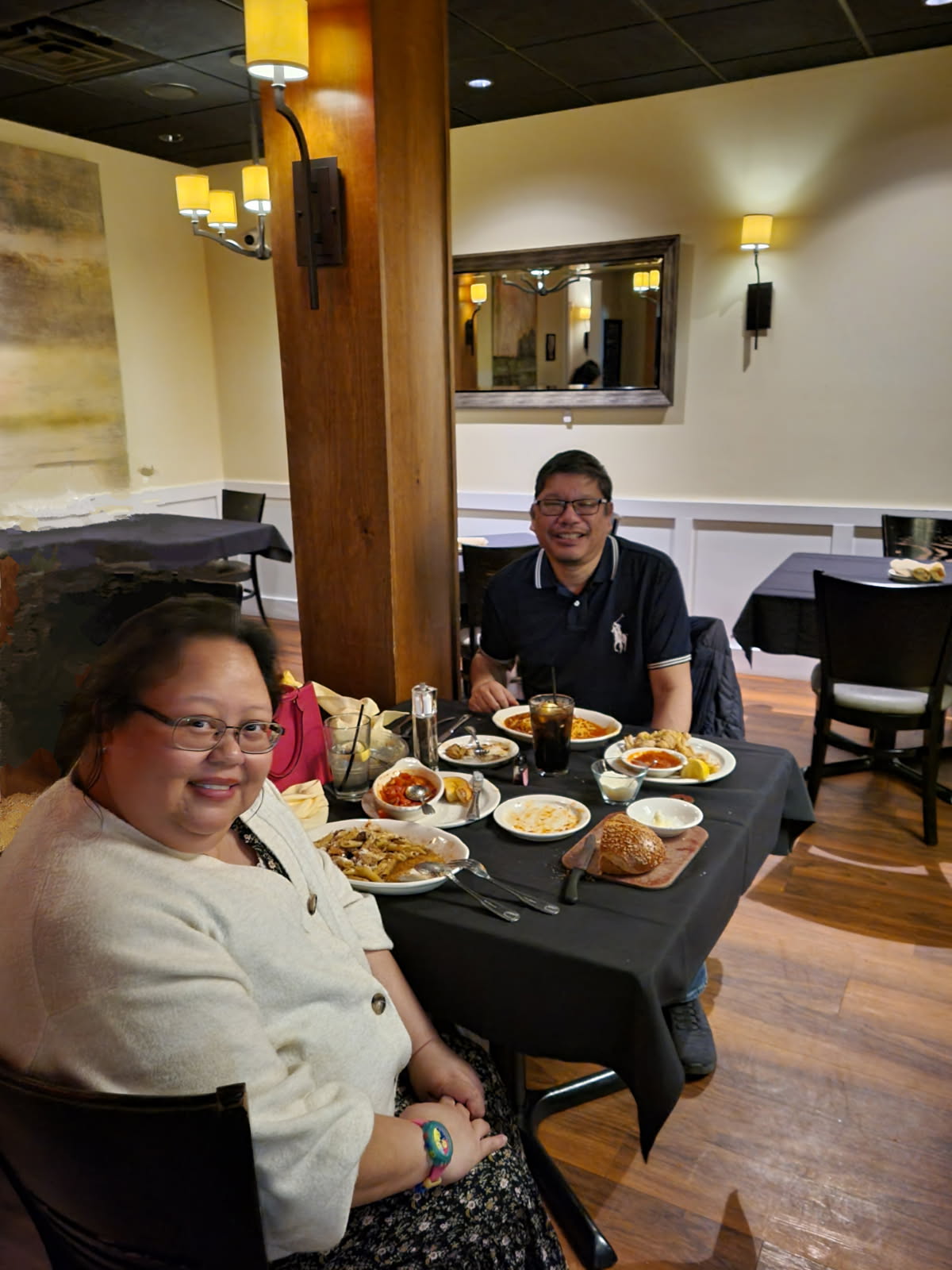 There isnât one thing that was disappointing. The restaurant itself is cute and warmly decorated. Our server Sarah was on point from beginning to end. She greeted us right way and took our drink order. She also gave several good recommendations to our menu questions. Each table is served a loaf of fresh, warm Italian bread, homemade garlic bread and family style salad with their own vinaigrette. Both types of bread were fantastic! The garlic bread is exceptional. We started with the bacon wrapped scallops. The bacon was crisp and cooked perfectly. It wasnât fatty or soggy. It was really perfect! Scallops were tender and the wasabi dipping sauce had just enough kick. My entrĂ©e was the 18 oz. cowboy ribeye, medium rare with sautĂ©ed spinach and broccoli rabe and garlic. The steak was superb, cooked perfectly and very tender. My veggies were excellent. Both bright green so I am assuming they got them from a local farm. They were both in a light broth with a little oil. Broccoli rabe had a touch of red pepper flakes so they had a kick.
