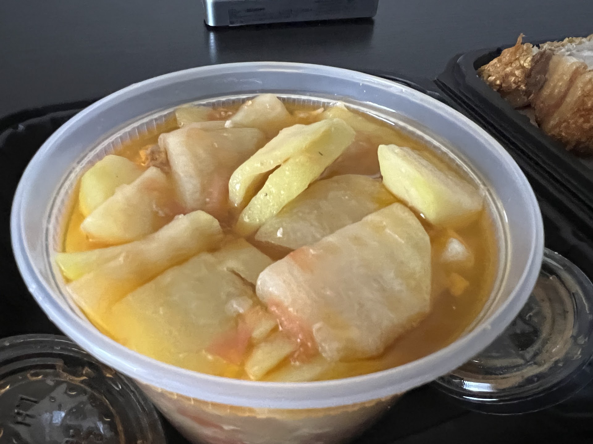 The Ginisang Sayote was flavorful, with a very mild kick and some minced pork in it. It was soupier than some other versions of this I have had but not bad at all. Of the two items ordered this was the warmer of the two and came in an 18 oz container.