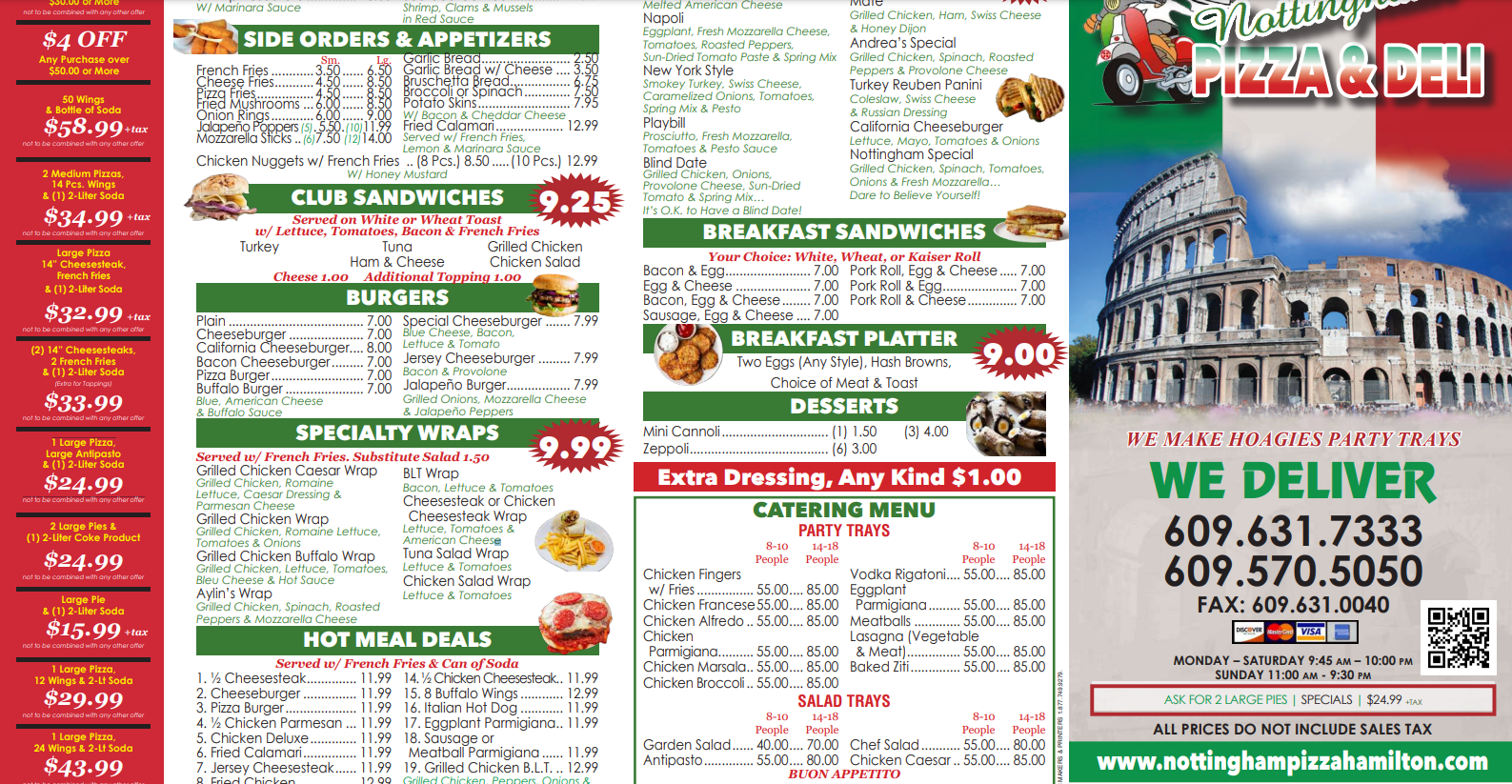 Read moreI've been ordering from Nottingham Deli for years. Great food. Just like all of you mistakes happen, and they work with you to fix any issue. I usally pick my food up, so the wait is never long. Delivery, like most restaurants, takes a little longer. Especially during busy hours. Their prices have never been to high and the quality of the products have always been good. With the quick online ordering, you can schedule a time for pick up/delivery or get it now. Pay with a card, or cash. If you haven't had it yet, i recommend the prosciutto bread... updated. I don't know what s wrong with this place. however I will start looking else where. Just plain sad. Not the first timei got my meal and looks like it was dropped. It will be a long time...