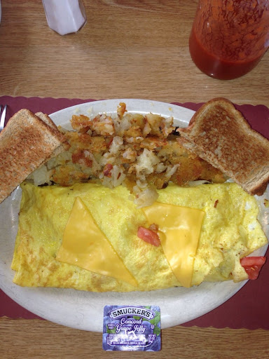 Every order has been carryout. The parking lot is gravel or crumbled asphalt. Hard to tell. The exterior roadsign is terrible to non-exsistant. If not using GPS, you will pass it. They still have truck parking in the lower back lot. They spent some money on the inside re-furbishing it, from what I remember back in '95. It's standard diner fare with reasonable prices. I've seen many of the menu options from what I pick up for other co-workers. How they eat fries from carryout, I will never know. I find the Southern Omelette to be one I have ordered more than once. 2 big styrofoam boxes for one meal. I call the hashbrowns and toast, the carb box. I always give it away. One co-worker now knows I do, and only orders gravy to top it. That means the Omelette must be big to get a box to itself. It's HUGE! I still only eat half of it. I have also had the daily special. Which on that day was chopped steak with 2 sides and roll for $8 or $9. It was a very brown meal that did not make me wish that that is todays special. The restroom is in the small lobby foyer, and a bit sketchy. They do accept credit cards, but have no WiFi. There are several TVs hanging in corners.