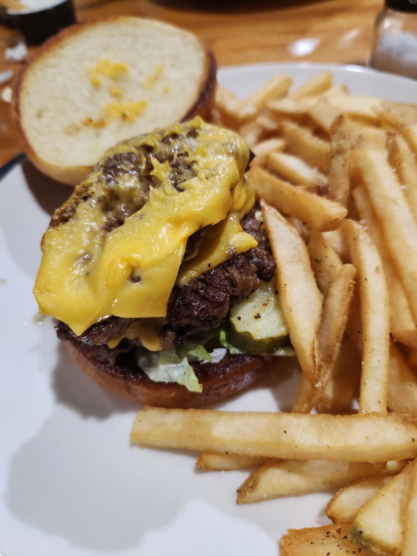 Fortunately, the ribs had a good flavor due to the barbecue sauce, but the texture and taste of them was more like they were frozen and then thawed, then cooked, it just wasn't at all what I expected and left much to be desired. Needless to say after me forcing myself to eat several bites I finally had enough. The kids hamburger was so thin when I opened the bun to put some A1 sauce on it I realize just how thin and frail the patty of meat was. My daughter wouldn't eat it, which is rare because that is her favorite thing to get no matter where we go and she devours it everywhere else, so we swapped plates and I took my first bite hoping it would be more flavorable and better textured than my ribs, but there was no taste. All I had basically was a bread burger...all bun, with lettuce, a tiny piece of tomato, and two little pickles.