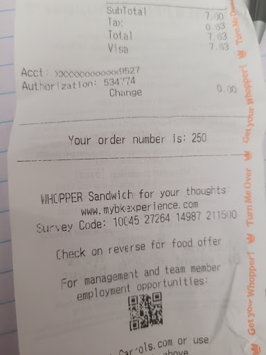 Read moreMy family and i stopped by on our way home from a ball game. It was 7p when we pulled in with 3 vehicles infront of us. When we finally got to the speaker to order we were told to wait a min ( bout 5min) on the screen was the DUO 2 Jr whooper or 2 ck sandwich or 1 of each, we ordered 1 of each and then what my husband and I got. We finally get to the window and they wouldn't take 100$ then was asked if we wanted our receipt , well yes we do. When getting the receipt my husband notices we were charged for 2 Jr and a ck sand instead of the DUO as advertised on their menu so we asked either to get the burger we were charged for or our money back...we were told that the DUO wasn't available until Thursday..but yet our receipt clearly shows DUO Jr whooper...all in all we ended up driving away. Very unprofessional when it comes to customer service and long wait time (730...