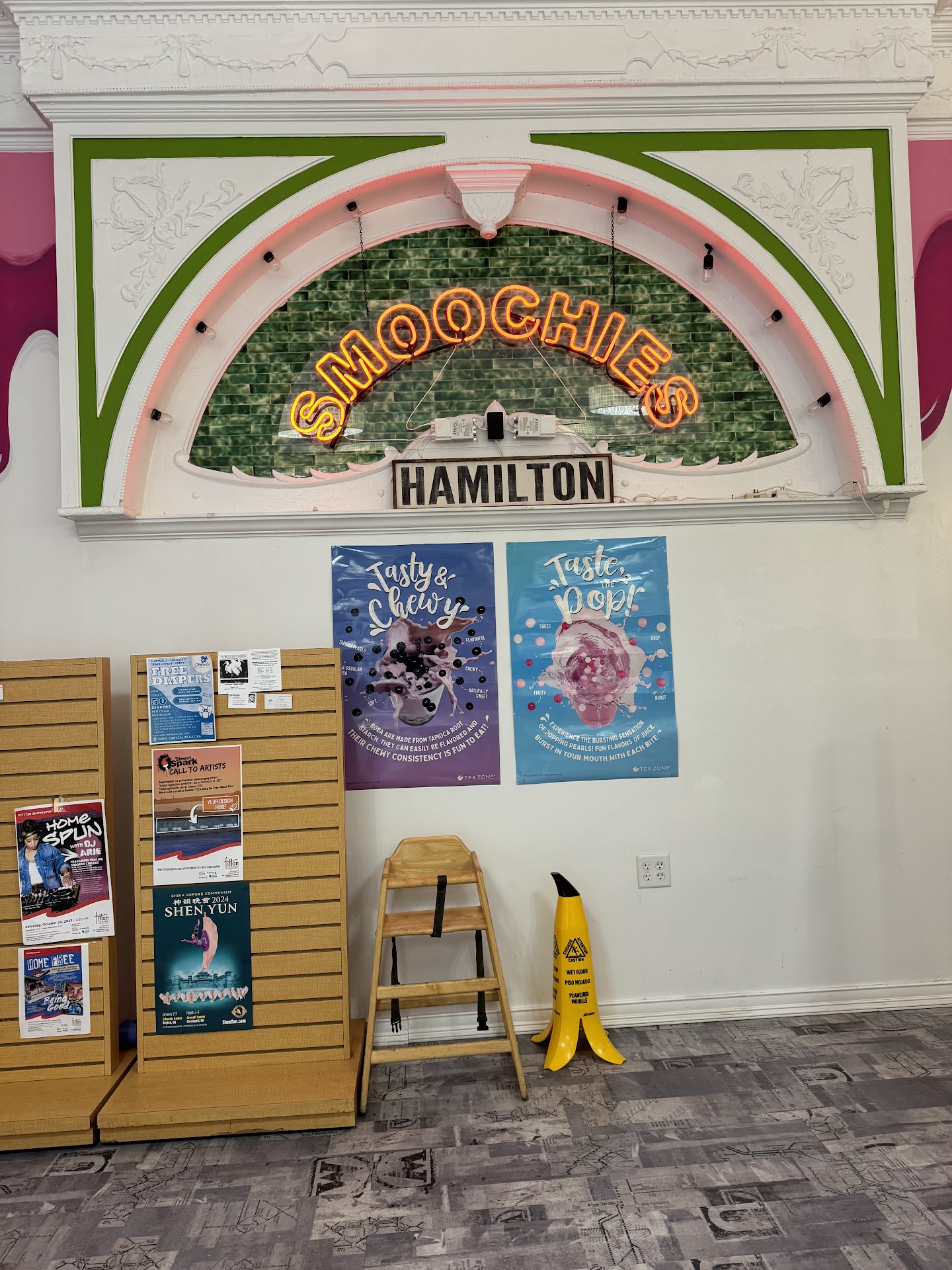 My family stopped here for the very first time while shopping in Hamilton. I was not certain if the business was open, since there was no one else inside, not even at the counter. Upon entering we were greeted by a young lady who took our orders and prepared the drinks. As I looked around I noticed that the tables were dirty and there was food on the floor. We used some hand sanitizer and paper towels to clean off the tables. As I drank my smoothie I noticed that the floor had not been swept for a while. It's hard to believe that the people who work here do not have time to clean the tables and sweep the floor. The drinks were okay, but nothing special. I doubt that I will ever eat here again. If the owner reads this review, I urge you to train your staff to clean your business when the staff have downtime. Photos...