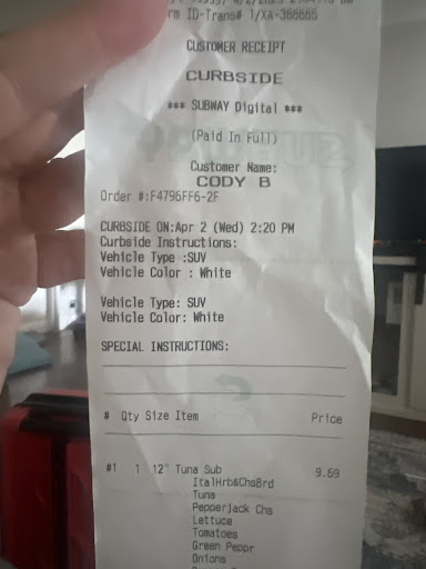 I visited this subway at 2:15pm on 04-02-2025. I received a sub sandwich to which I paid near $10 for on the app. When I did curb side pick up I got my sandwich went home and saw I only got tuna, onion, green pepper and banana peppers. I called to complain and the manager got upset and claimed she made it and she made it how directed, except the recite shows more to the sandwich. When I told her I was coming, she waited for me then I explained to her to take a look at the sandwich- so she did. Then told me she wasn’t the one who made it, told me the other girl said she made it to order and that I took it home and stripped the sandwich myself to get something free. At some point many words were exchanged and she also managed to tell me I called and corrected my order and it should have only banana peppers on it. Even if that was done so the order would have still been wrong. She told me she could not remake it because they made it correct when they DID NOT. Then took my number and said the...