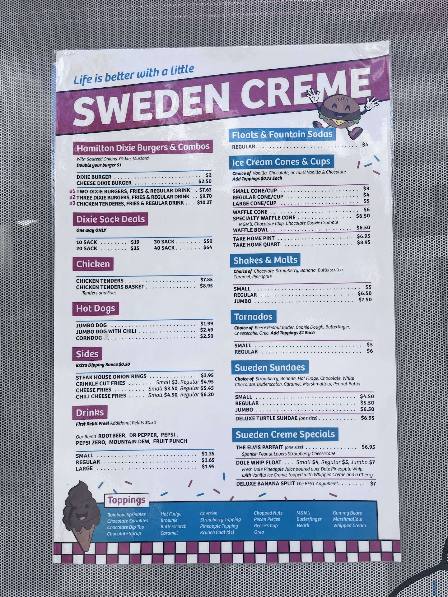 Read moreBeen coming every weekend all spring for eats and treats. Several times I was treated rudely, they messed up my orders, missing ingredients (they run out of chili often) and a mysterious "soda tax" that no one else charges. Also if you do not tip, you get mean looks, spoken to gruffly and made to wait extra long for your order. I had been holding off on a review because my experience has not been consistent. The food (when they have it) is good and fairly priced. Some of the employees are nice and seem competent. But tonight sealed my opinion. Please avoid at all costs, go down to UDF and Burger King, Sweden Creme is not worth the gamble. Decided to treat the family to burgers and ordered a 20 sack. When I requested that 5 burgers have no onion I was told that was impossible. The only way they could do it was to ring it all up seperate, which would not matter except it was like $15 more expensive. I cannot even comprehend a business that can function in this manner. In the 21st century you cannot just order a burger how you want without being taken advantage of and made to pay. I am deeply dissapointed at the blatent greed and thoughtless spitefulness that infests my local neighboorhood icecream parlor where I routinely take my family. I do my best to shop local and support the city so this...