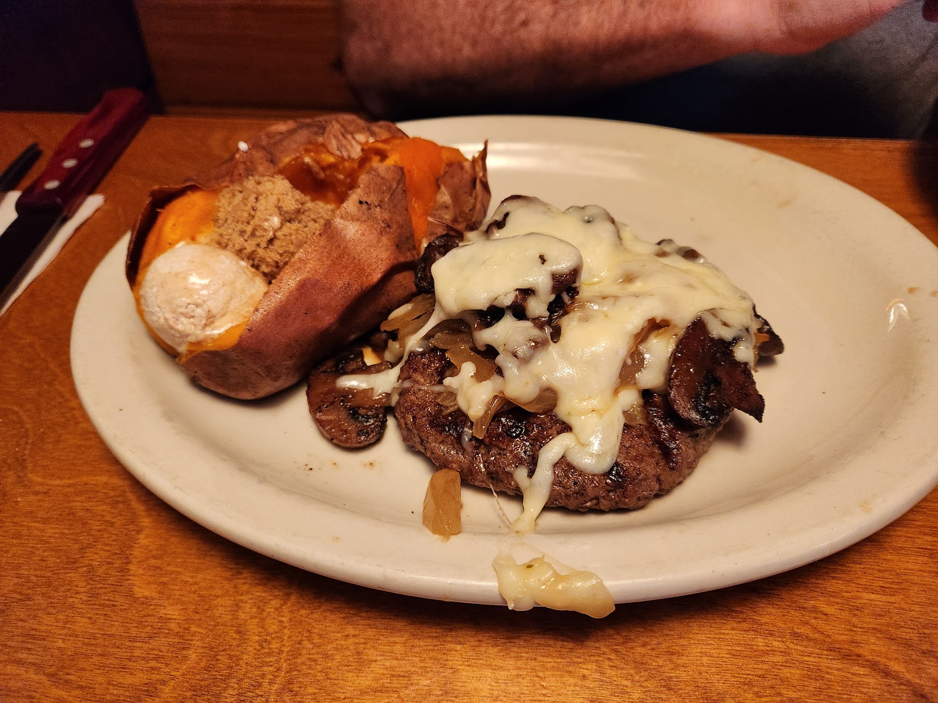 Today, my friend and I wanted lunch, and we chose this location because we like the entree selections on the menu as well as their side salads. We ordered steaks, sweet potatoes and side salads. Our server appeared to be very busy, so when we needed clean silverware (what we received was really gross -- I think someone must have wrapped unwashed utensils!) we asked someone passing by. That person just happened to be the manager. Got a chance to talk with her again when she came around to ask how things were for us, and I told her that the replacement silverware wasn't clean, either. She apologized, but did not seem to remember she had already brought us silverware due to the same reason.