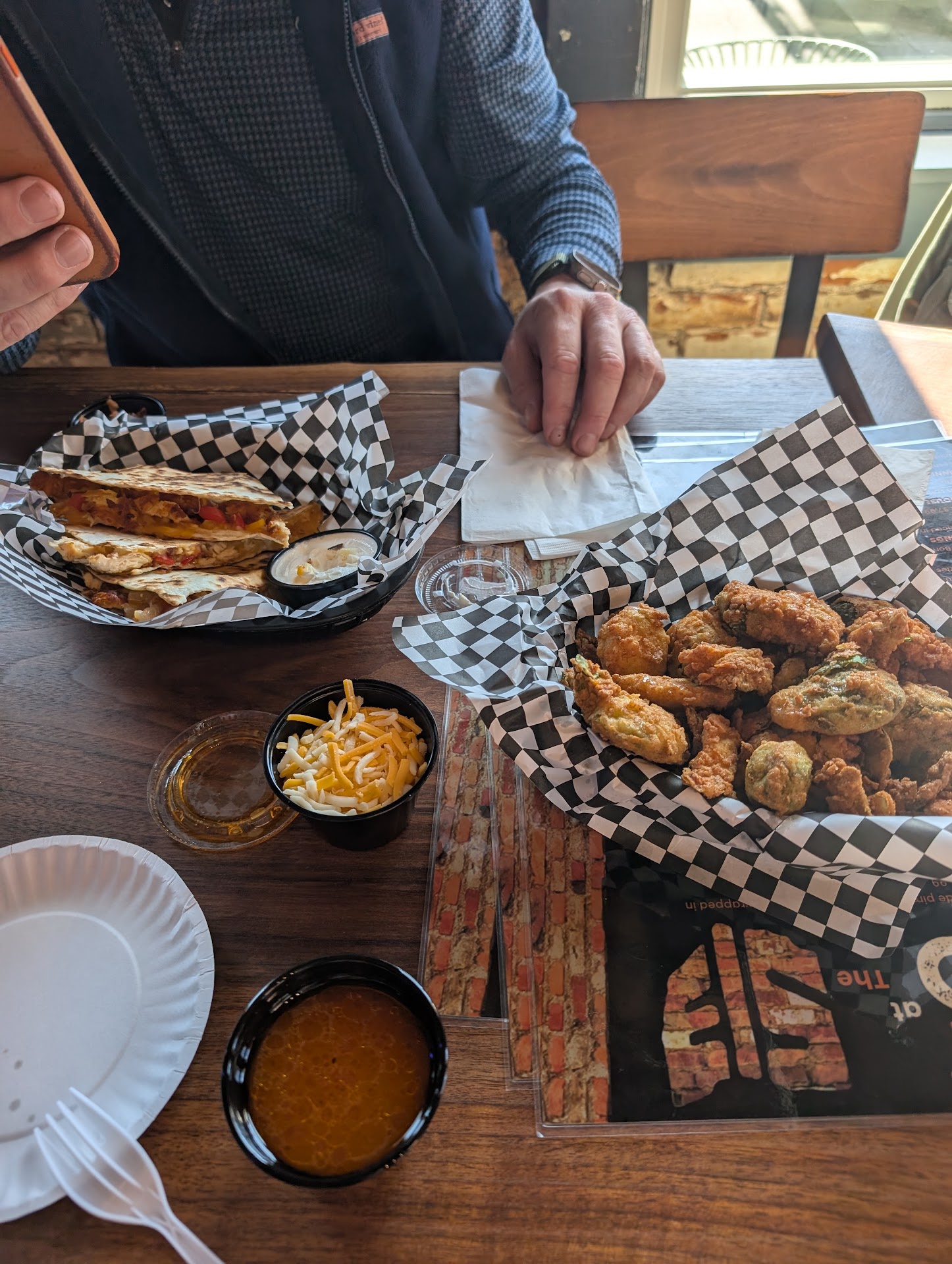 When the appetizer arrived, it was moderately warm at best and incorrect. What was ordered was the BBQ nachos with jalapeno on the side, with pulled pork instead of pulled chicken. What arrived was pulled chicken with jalapenos on the top. Not a huge deal, but the food was not hot, or really warm, at all. The price for the app seemed a bit high as well. $14 for a handful of Saratoga chips, a scoop of pulled chicken, cheese, pretty raw onion strips and cheese. 3/5