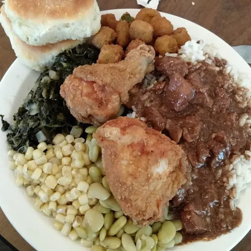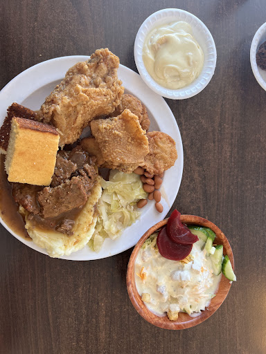 They have good steamed cabbage. I don't think it is seasoned with meat, but has a sweetness. They have a good salad bar, which includes pickled okra. I can make a delicious potato salad using their potato salad on the bar, add sweet chopped onion, sweet pickles, and chopped hard boiled egg. And, I like their carrot cake, but they have other desserts.