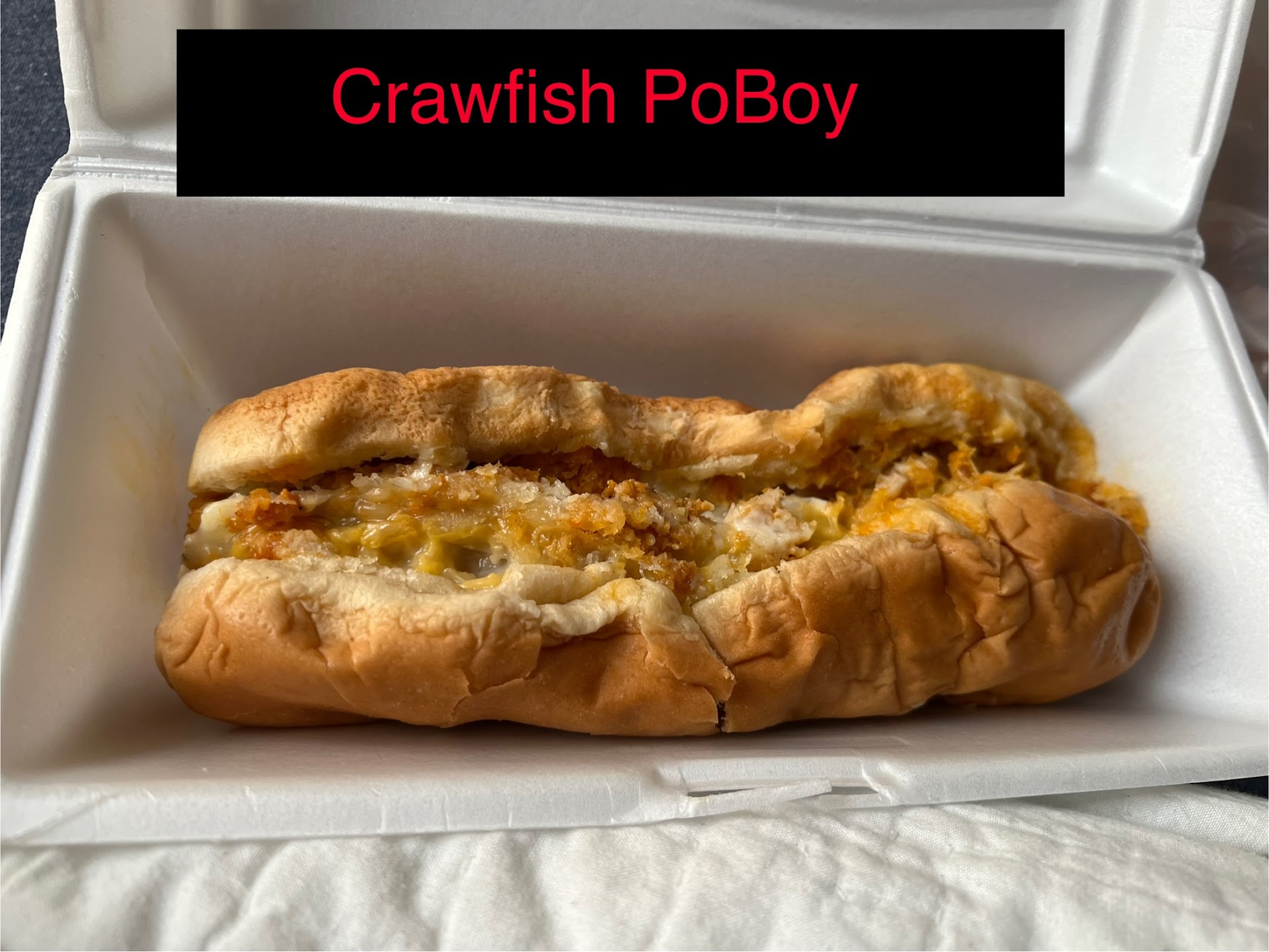 ** CRAWFISH BOUDIN POBOY - 6-7 out of 10 It is NOT āDRESSEDā like normal PoBoys. It is simply crawfish Boudin on what I think is bread used for their Hot Dogs. It does seem small without all the Dressing, but it does a pretty good job of being filling. So, Crawfish, Breading, Cheese, maybe rice? The 1st time I got one it was wrapped in plastic wrap so the steam turned it more mushy than it should have been. Thankfully, that only happened once, all the other times it was wrapped without the plastic! Q:WOULD I ORDER IT AGAIN? A=YES! & I have a couple of times! The Crawfish Boudin Links arenāt bad either!