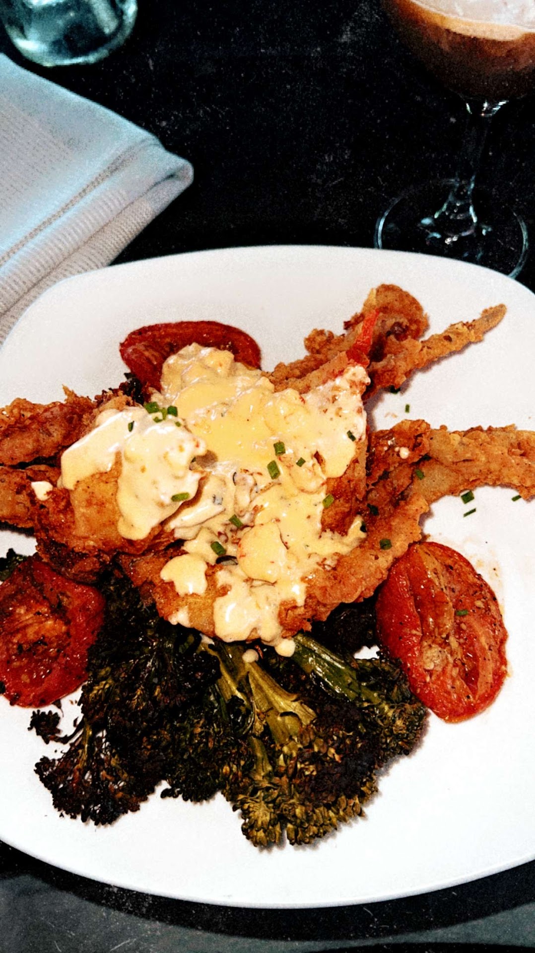 Dinner: I ordered the soft shell crab stuffed with seafood shrimp polenta and topped with a crawfish cream sauce along side broccolini and roasted tomatoes and a side of cranberry glaze. This was the taker. Everything was so well balanced.