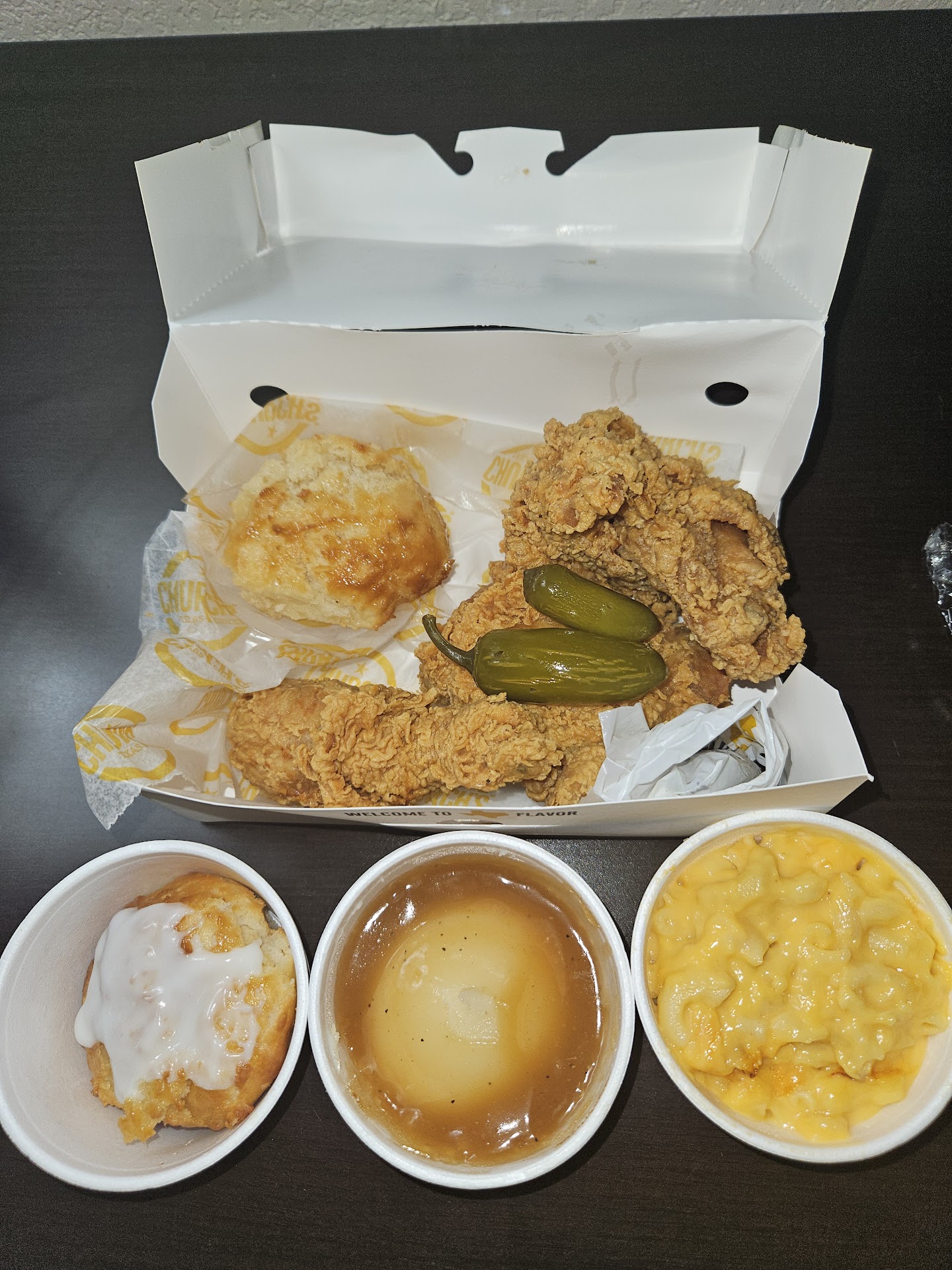 The sides all tastes the same. 2 out of 5 stars. But the chicken is definitely better in Louisiana. I have the definite feeling that it has something to do with how recently the chicken was cooked.
