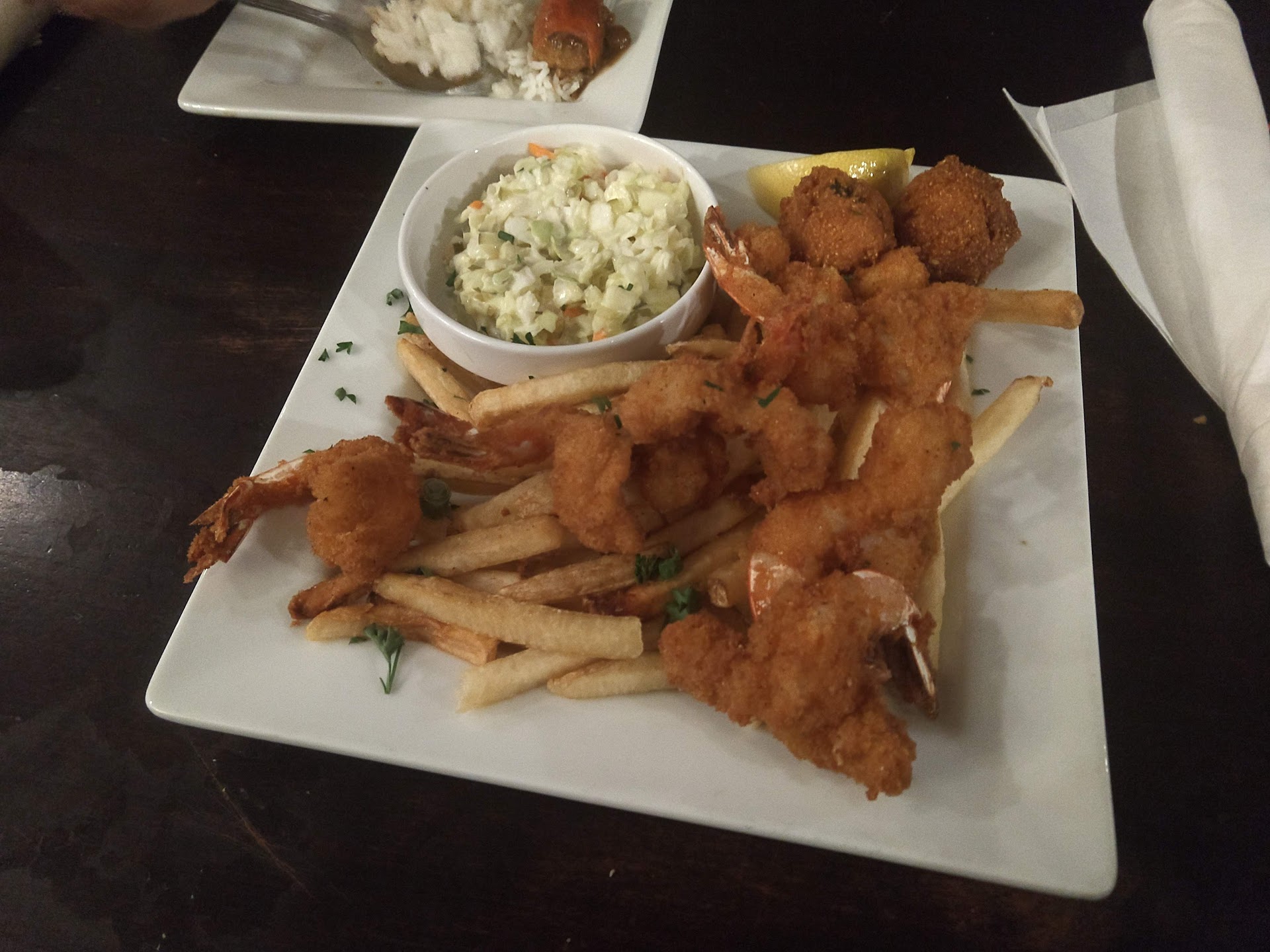 1 star is a restaurant so bad it actually makes me throw up. 2 stars is a restaurant with no redeeming qualities other than the fact it didn't make me sick. 3 stars I reserve for restaurants with glaring issues but some redeeming qualities but not likely to try again soon. We tried this restaurant four years ago and had a similar experience. First impressions: bad parking. I would be surprised if there haven't been at least a few injuries or fender benders here. Second: no front sidewalk so walking from the back forces you next to the foul smelling dumpsters. Third, fantastic entrance with friendly staff. Fourth, nice decor and pleasantly loud - not so loud to hurt but enough to know people are enjoying themselves talking. Very clean. Now for the food: Expensive. Particularly for the issues. The bread served at the beginning of the meal had oily butter, which might be fine sometimes, but it was excessive. Fries were stone cold in the center, not surprising for the bottom which were on a cold plate, but surprising for the top layer. Hot outside, so the fryer temperature was up too high. First serving of rice for three of the dishes was dried or undercooked , one inedibly so. The replacement was good. I liked the flavor, but it wasn't what was expected for the name of the dish (etouffe - brown gravy vs expected red tomato). The crawfish bisque was also not a flavor type expected as it was too savory and not a blended soup. While good, just isn't what is expected for a bisque. The chicken andouille tasted good even if the rice wasn't good. All that aside, my highly picky nine year old son that rarely eats more than a bite actually finished half his grilled cheese sandwich with fries. My broccoli wasn't mushy and had a fresh flavor, even if a little too on the al dente side for my tastes. What saves the restaurant from a 2 star rating truly is the service. Excellent customer service, nice, friendly, attentive without being disruptive, and swift to replace the undercooked/dried rice dish. Replacement dish was very fast. Perfectly cooked replacement. If the prices were less, I might have upgraded the restaurant to a 4, but we've had consistently lower prices (15-20% less) from other seafood restaurants in the area with better waterfront views and flavor with equally good customer service. Granted, this visit was on a Wednesday night during the holiday season so it is possible that it was just a bad night, but we had similar issues four years ago. Which is why it took four years...