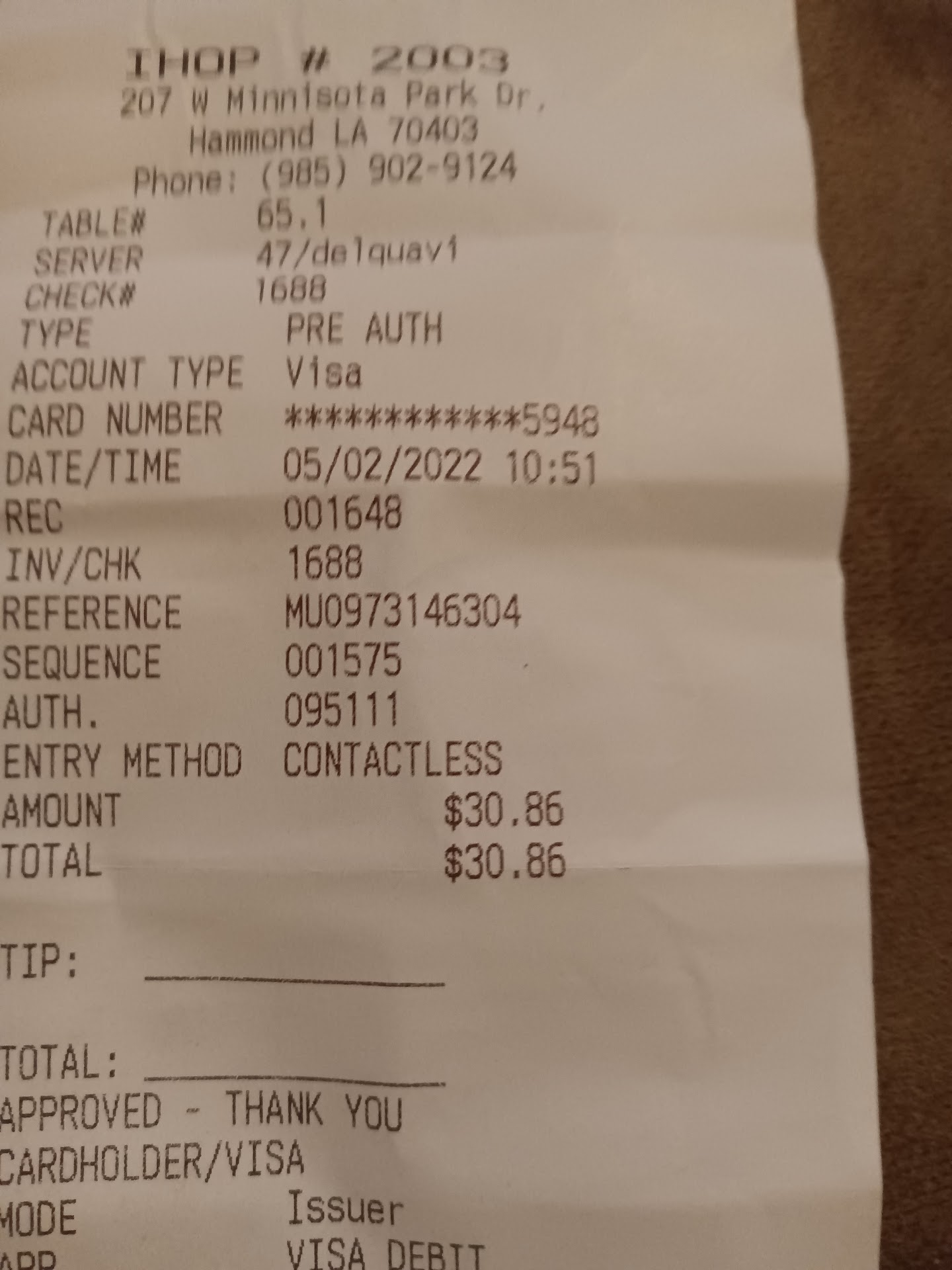 Read moreHope this feedback finds you well. I am a customer who will like to address a customer service experience at one of your IHOP location in Hammond, La. Upon arrival to the restaurant on Sept 14, 2025 @ 10:15am, my family and I had high hopes of enjoying a great breakfast. Needless to say, that was not the case this morning. Upon arrival to the restaurant after hostess seating. The waiter in our section was not professional with their customer service skills. We sat for about 15 min plus before the waiter came to us to take our drink order. Upon coming to our table, their was not introduction of the waiter name to us, no curtesy of acknowledgement at all. The first thing said to us was "what do you want to drink". After drinks was given to us, 20min later our order was taken @10:50am. My family and I sat from 11am to 11:47am waiting on our breakfast to arrive. During this time not one time did the waiter come back to us to ask if we needed more drink or were we ok, nothing. My husband then went and spoke to a manager and asked about our food as to after a 45 min wait we had not received in a timely manner. Nevertheless, after an hr wait, our food came to the table cold with missing sides. Not one time did the waiter even come back to our table after our food was delivered to ask, if everything looks ok, if their was anything we needed no nothing. The situation with the food and waiter was also brought to the manager attention. An apology was made from the manager and that was it. No kind of consideration to the situation at hand. By this time, aggravation had already sat in. My family and I ate cold food, with bad customer service at this IHOP location. Nevertheless, we will not be back to patronize your restaurant. Wishing you the best with finding good workers who know to exercise customer service skills in this field. Looking forward to sharing my experience with many...