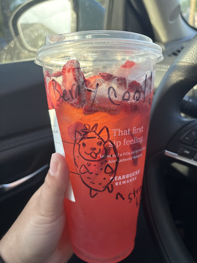 Every single time I've been to this Starbucks, the baristas have always been so kind and nice! I go through drive-through a lot and it’s always run very efficiently. The baristas always put little illustrations on my cup, whether it’s a smiley face or something more. I went today (April 17th) and the barista helping me out in the drive-through was super nice, and I’m not sure if it was her or another person, but they drew a strawberry kitty on my cup (I ordered a strawberry lemonade refresher) and it has literally made my day. It made me want to turn around and go back into the store to thank them personally and tell them how much I loved it, but I hope this review can...