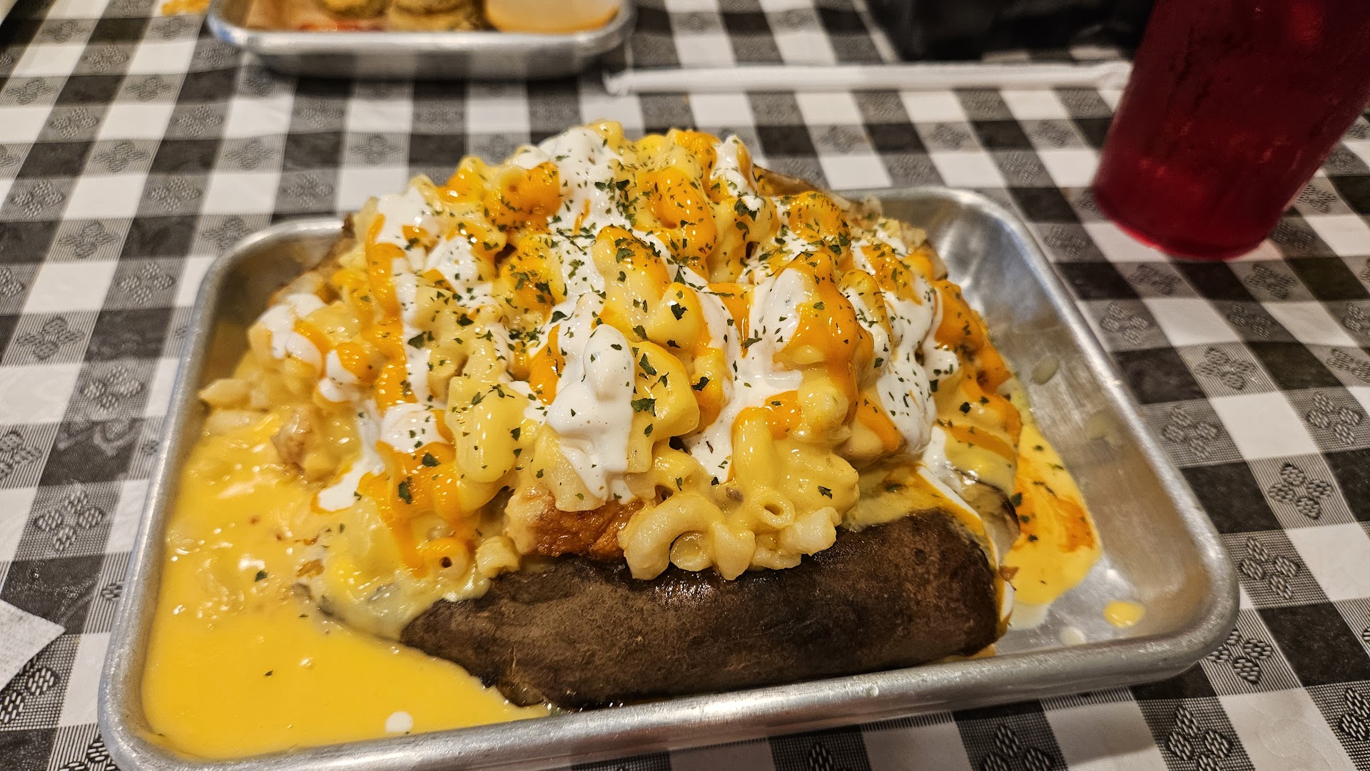 Read moreWanted a loaded baked potato so my fiancé and I decided to give it a go. Boy, we was not disappointed. We got fried pickles ( one order is enough to feed 4 people, well with the value), the pulled pork & mac eggrolls ( really good, he loved them and portion was hefty for $$), a chicken Parmesan poboy ( they are 12inches not 6inches, so make note, stuff very well, and hot), and lastly the buffalo chicken potato ( this thing was MASSIVE filled to the top with fried chicken, Mac and cheese, and sauces!! It was very good but beware it has a little kick). The front of the house staff was so sweet and had such a nice smile from the start, another staff member greeted me very politely and immediately called for someone to give me my order. I would def try eating in next time. It’s a smaller restaurant with homie college vibes. I would definitely recommend this place if you want a po boy, or a potato. I read some of the 1 star reviews and I do not agree with them. Every restaurant has ups and downs, it’s unfortunate but it does happen. My experience tonight was great, the food was great, the portion for the $$$ was very good ( especially with these times we are in), and the staff was nice and inviting! Good job...