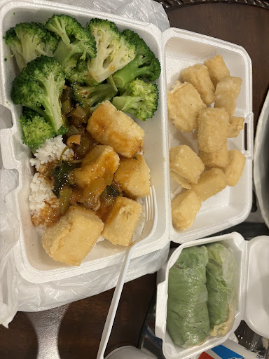Ordered the Tao Hu Hor and vegetarian Spring Rolls (not fried). The entree consisted of fried tofu, jasmine rice, steamed broccoli, and a basil sauce.