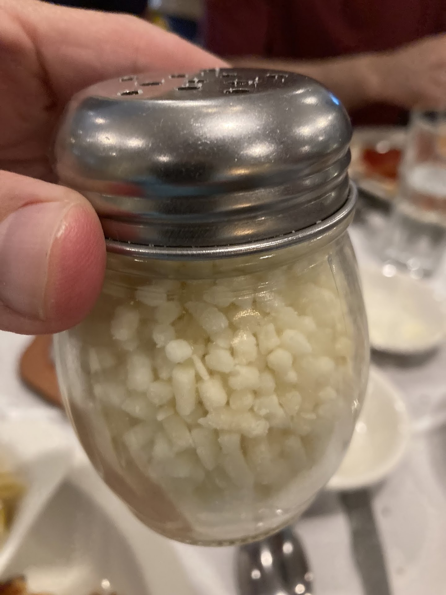 One thing I had heard about Joe Italiano's is that they have the best homemade pasta. I ordered penne with my meal, so I was looking forward to trying it. When I asked for the grated cheese at the table, I was handed a dispenser with big chunks of cheese (see attached photo). Care to guess if any cheese came out when you shook this dispenser? What rocket scientist put this together and placed it at the table???