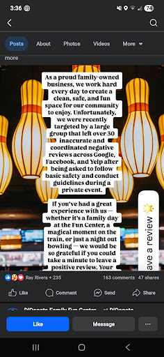 If I could give 0 stars I would. Had a tour stop here for UBA. We get here and we get cussed at for being here. Get told we're not having a tour stop then we're going to be moving a pair of lanes. DURING the whole conflict this grown man starts cussing and yelling into the mic while children are in the building which I find EXTREMELY unacceptable. Not a place I would call "family friendly" and I don't think I could ever support a bowling alley like this. The way all the bowlers were talked to was disgusting, the lack of communication would have been between the UBA officials and the bowling alley owners. Im disgusted that a grown man will yell and cuss at people who did nothing and in front of children. The lack of regard for human decency is pathetic. I will never come back nor support a place like this. Absolutely unacceptable behavior, regardless of your position, it's unacceptable.