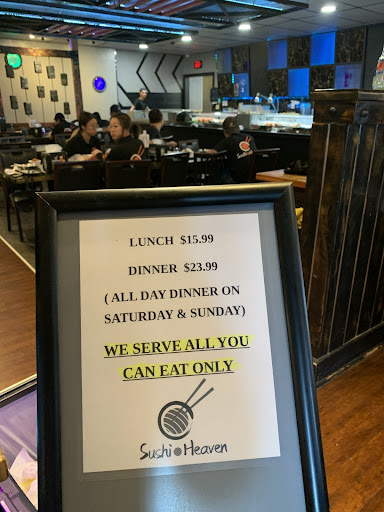 Read moreWhat can I say about this place other than the fact that if you love sushi you have to go here. I have been to several Chinese buffets and got their sushi which is good but then when you go to a Japanese style restaurant, you order a roll or two of sushi you find that the buffet option isn't as good as when the more professional style restaurants do it. So what do you do? You spend a large amount of money to have a decent amount of sushi but not a large amount of sushi. Enter sushi heaven and it took the best of both worlds and put them together. When you go inside, the waitress comes around with a tablet. There's over 80 different options on a menu. Most of it is sushi but there is also some American style stuff like french fries, hot dogs, chicken nuggets, or you can step more into a Chinese style stuff such as noodles, egg rolls, things of that nature, but regardless of what you order, the young lady stands there and take your order until you say I think that's enough within minutes. Somebody's already coming around to your table with your stuff and they will load you up with so much food that for the first time ever. I actually got full on just sushi. Nothing else now. There was a crab rangoon or so that I had but mostly just sushi and they keep coming back and asking you if you want more. It was the best sushi experience I have ever had. Everything was so delicious. It was fresh and honestly it costs a little bit at 22.99 a person for adults but you pay one flat rate and after that you can order as much as you want. Drinks included as well as dessert at no extra cost and it's BYOB. This was by far the best place I've ever had. Sushi and I absolutely plan on going back there as soon as my pants...