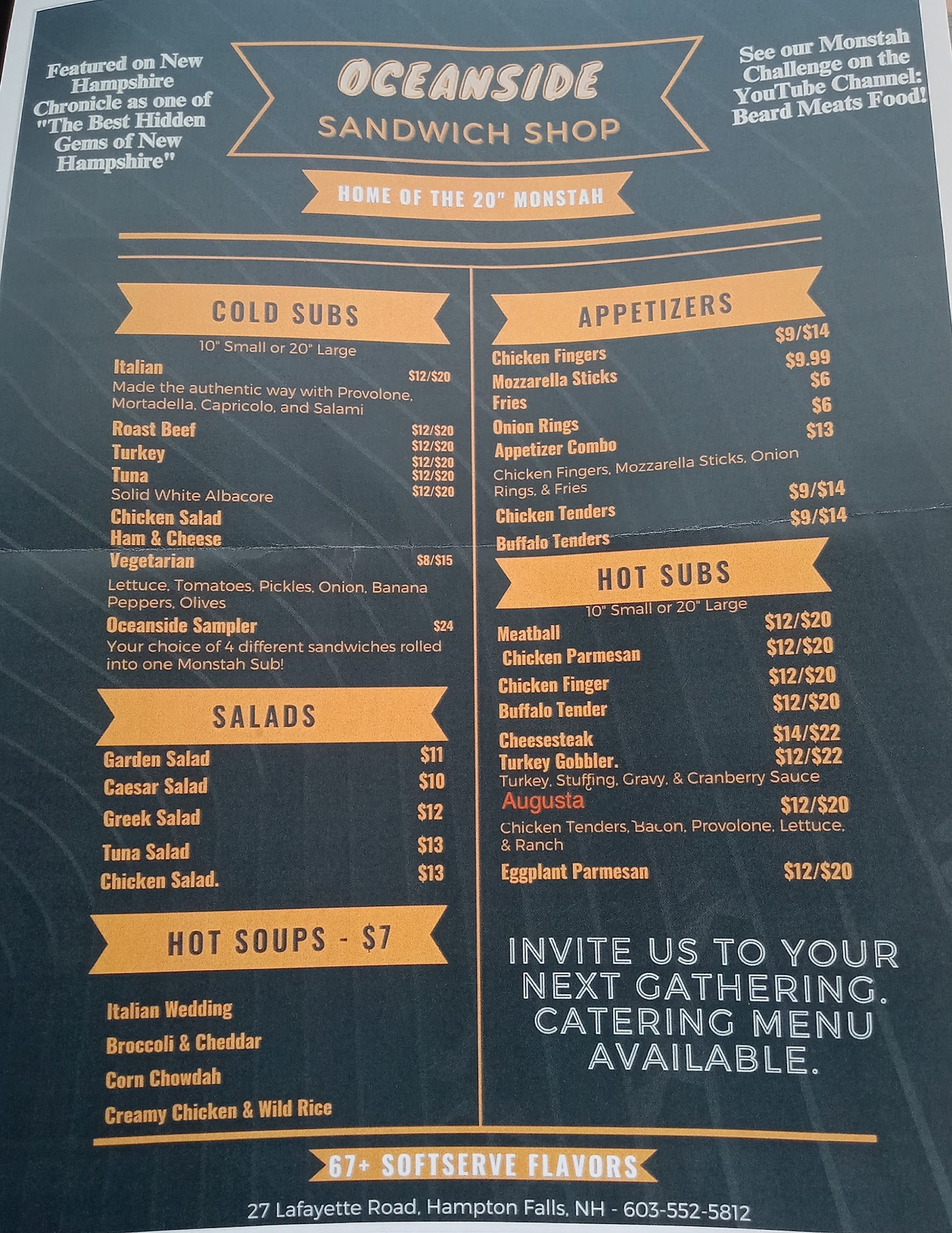 Read moreLast week my wife and I were heading home after a walk on the beach which we don't get to do often. We've driven by many times, but never stopped or even really noticed. I was so hungry and I was telling my wife how nowhere serves real food. Non-Frozen meals are rare. These two gentlemen were amazing. My idea ordered the Cesar salad and I ot a large 20' steak and cheese. When I say the word "Fresh"! I talking about the juiciest Big Man steak and cheese you could think of!!! Slight drizzle of deliciousness that sits on the meat without dripping off somehow. I'm not a salad guy, but my wife's Ceasar Salad was really delightful. Larger salad than I've seen at most places in the past. Very well put together and they have no issue layering if that's your preference. Very well put together. There isn't much seating which is a bummer because it definitely has a family feel to the place. We could tell that they enjoy they're jobs and explained how fresh everything is. It was nice to hear that they look forward to seeing and meeting new people throughout the day. If you want an amazing time, great food, and people. I'd visit Oceanside Sandwich Shop! I added an up-to-date Menu as well. Also please support local family shops no matter where you are. Thank you, Oceanside...