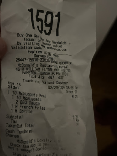 Read moreCan't give this location a 5, been there a few times, most times have been good though. The 4 star is because last time, even though I told the first window person what order I was paying for, the second window person didn't seem to understand which likely resulted in two orders being handed to the wrong people. This is probably caused because of the order both line up, and employees being too ingrained with the 'norm' of the flow. So, person out there, I hope you enjoyed the extra nuggets, and the deluxe 1/4 pounder while i got your small fry and plain double 1/4 pounder lol. Either way, not mad, things happen, 4/5 to hope they fix mix ups...